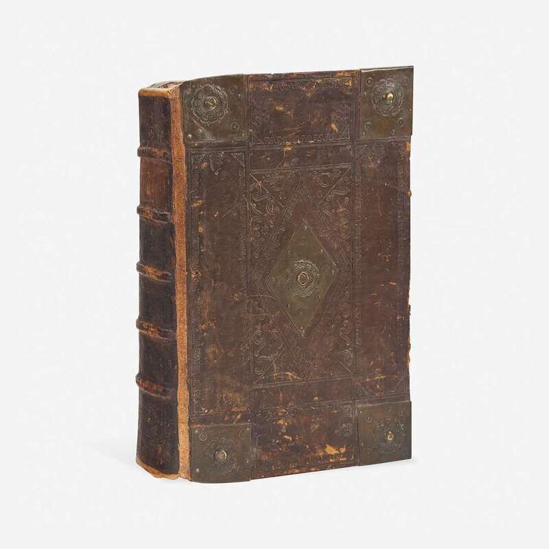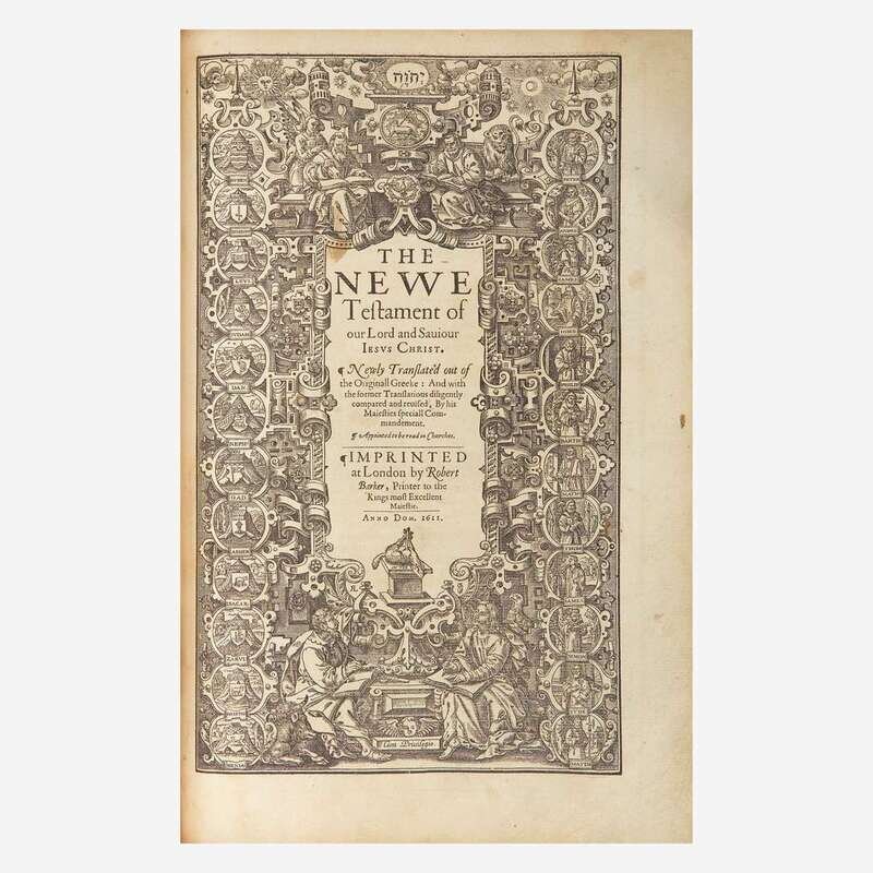 (London: Robert Barker, 1611-1613). Second folio edition. Folio, 16 x 10 1/2 in. (406 x 267 mm). (A3-4), B4, C6, D5, A-5C6; A6-Aa5; lacking two preliminary leaves (A1 and A2: general title-page and part of dedication); lacking final leaf Aa6 at rear; Genealogies bound in before Genesis, lacking John Speed map of Canaan and pp. 7/8 and 23/24. Printed in two columns, 59 lines per column; black letter; headlines, chapter contents, marginal references printed in roman type; calendar printed in red and black. Illustrated with an ornate woodcut title-page for New Testament, as well as woodcut initials and head and tail pieces. Contemporary full brown calf over heavy reverse beveled wooden boards, elaborately stamped in blind, foot of spine stamped in gilt, original brass furniture intact, rebacked with original spine laid down; all edges trimmed; modern marbled endpapers; edges and gutter of dedication leaf repaired; bottom corner B2 repaired; scattered soiling and light dampstaining to text leaves; large stains on leaves 3Y4, 4J4V-4J5R, 4N1, 4P5, 4Q2, 4U4, 5B5, A2R-C2R (New Testament), and K1; scattered repairs to edges, corners, and gutters, especially in New Testament, some touching letters; larger repairs on 4Q2, 4U4, 5B5, B4 (New Testament), D2R, D5, E1-6, K, S2-6, Bb6-Aa5; scattered marginalia. Herbert 319