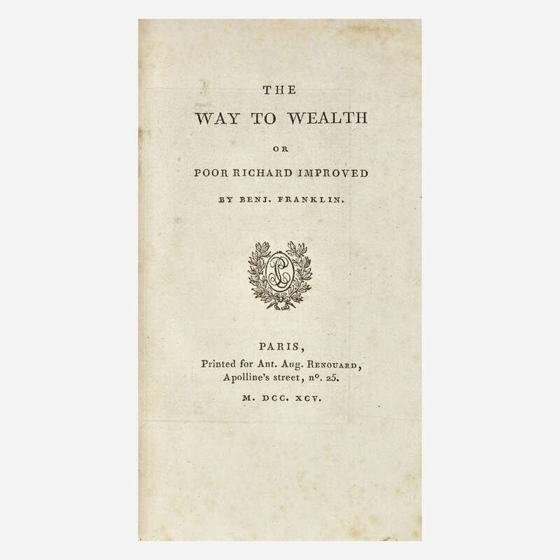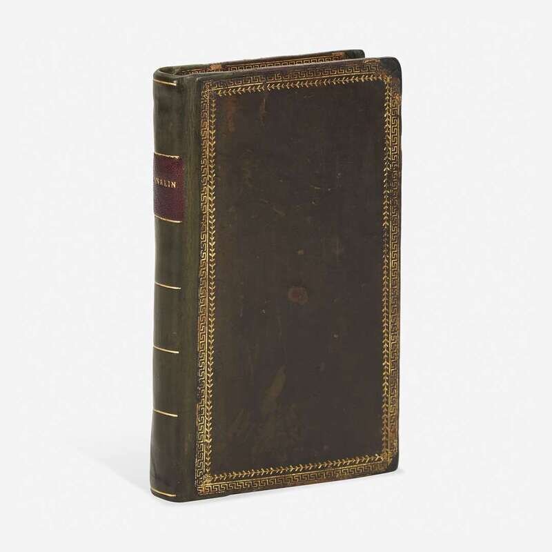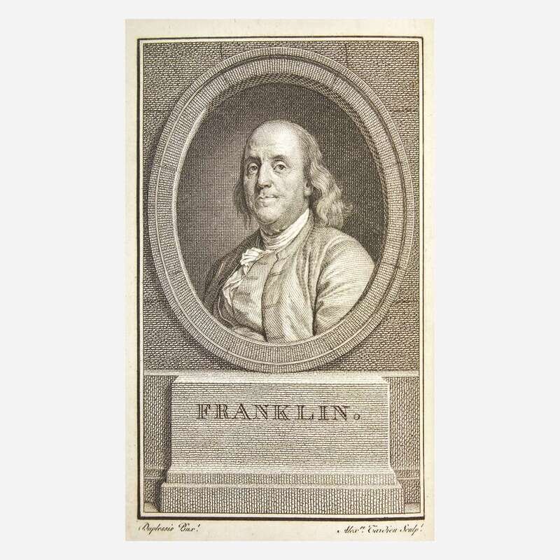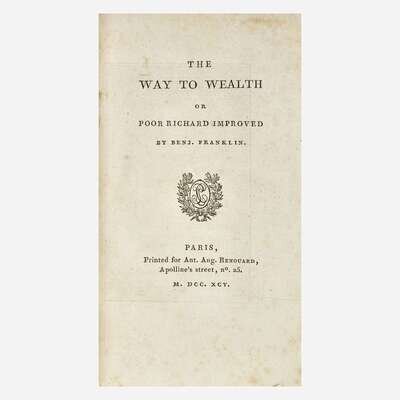 Paris: Printed for Ant. Aug. Renouard, 1795. 16mo. (iv), 181, (5), 28 pp; without ads found in some copies. Printed in French and in English. Illustrated with an engraved portrait frontispiece of Franklin, after Dupleiss by A. Tardieu. Full contemporary green calf, stamped in gilt, red morocco spine label, rebacked and corners renewed; all edges gilt; red endpapers; in marbled paper-covered leather-entry slip case. Ford 135; Sabin 25596
