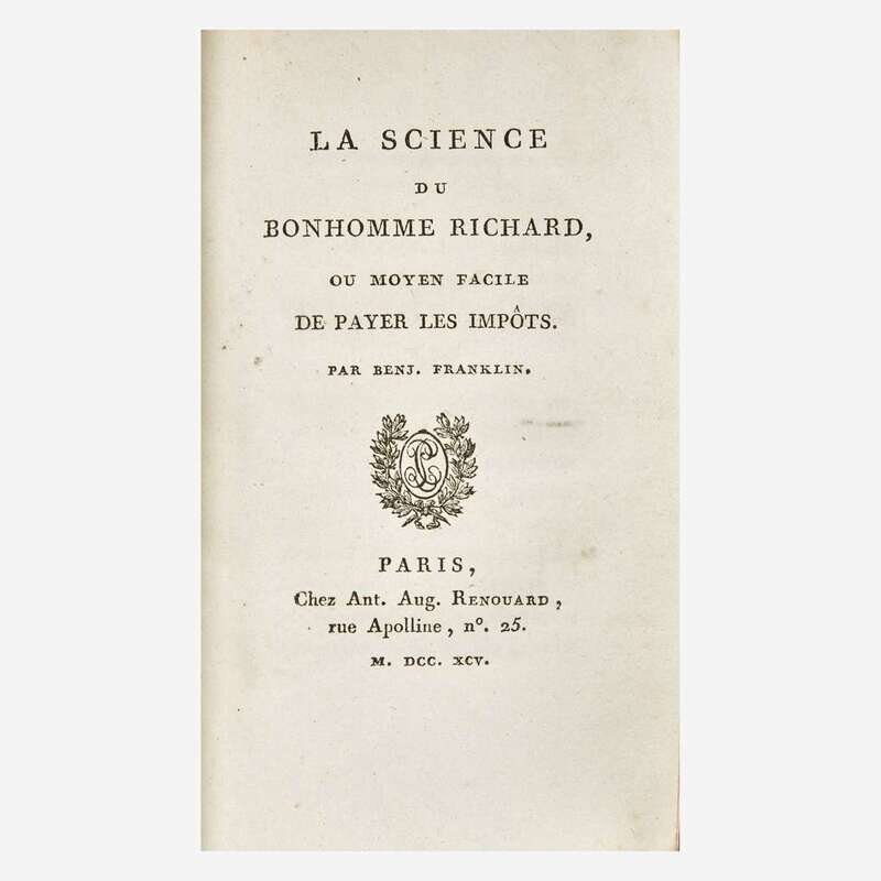 This edition by Antoine-François Quétant (1733-1823) was not the first French translation of some of Franklin’s writings. In 1773, Jacques Barbeu-Dubourg (1709-1779) published a translation of some of Franklin’s works, as Œuvres de M. Franklin, Docteur es Loix, but in 1777, Quétant published a new translation of The Way to Wealth as La Science du Bonhomme Richard, ou Moyen facile de payer les impôts.
