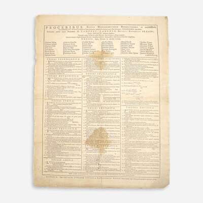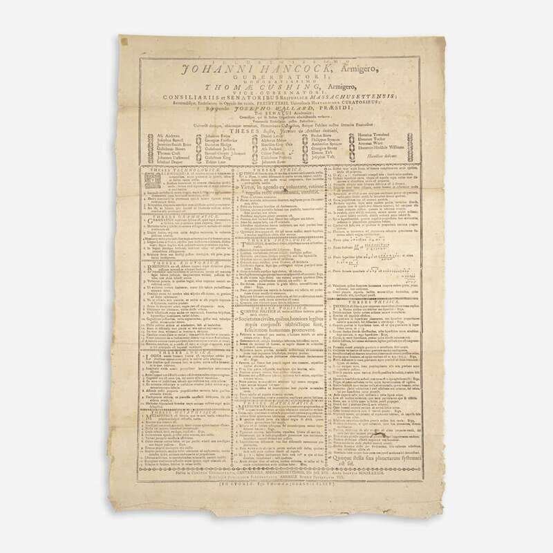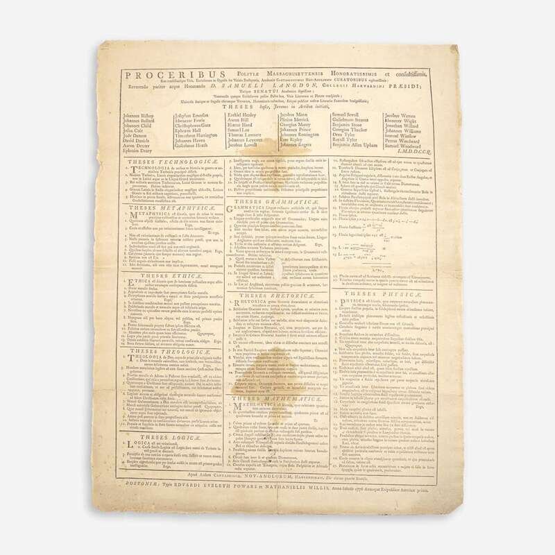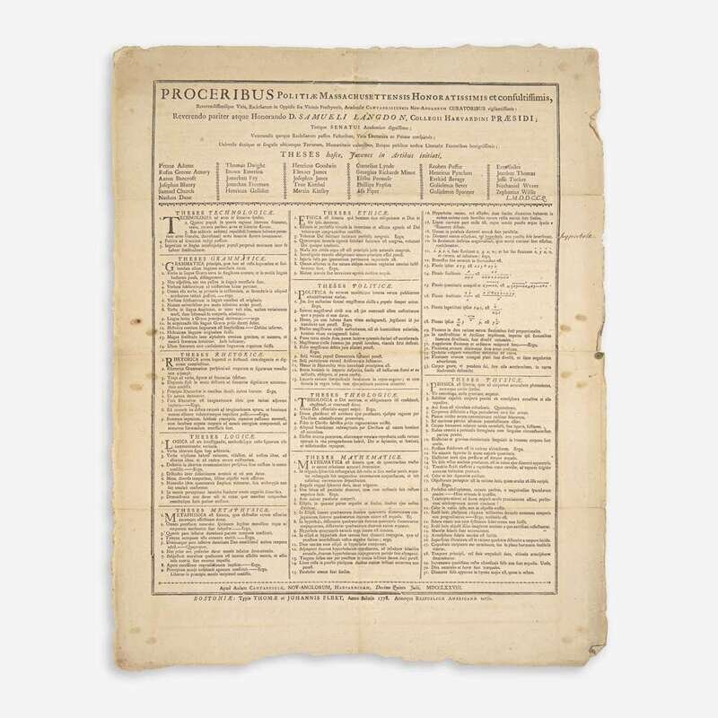A remarkably well-preserved set of three Harvard College graduating class theses broadsides from the time of the American Revolution. Each broadside is composed of a series of propositions that were to be defended by the graduating students on commencement day, ranging here from 129 to 160 listed items, related to different subjects, including technology, grammar, rhetoric, logic, metaphysics, ethics, theology, politics, mathematics, and physics. These broadsides were printed at the expense of each graduating class to reflect the range of their studies, and were typically posted in advance of the commencement ceremonies, where oral exams would take place. During the years 1775-80, public ceremonies were cancelled due to the war. These were printed in broadside form from 1642 until 1810, and then afterwards in quarto, and by 1821 they were replaced by commencement programs.