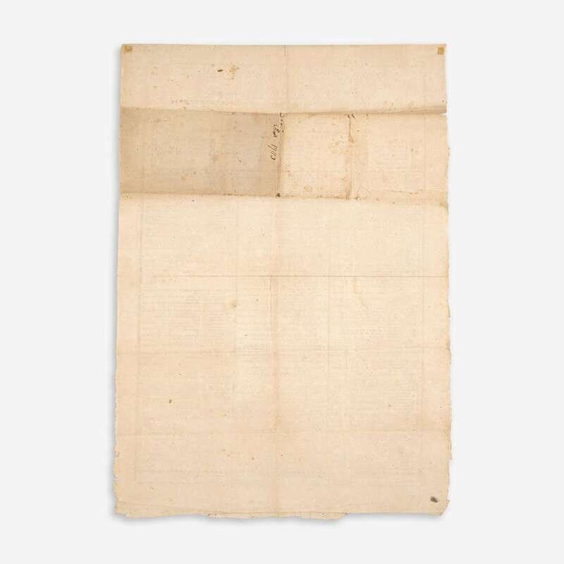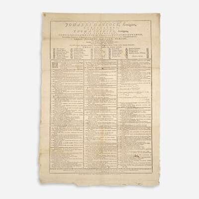 "The Theses sheet of 1776 is a notable one, since it is the first to be issued after the departure of the last Royal Governor and after the Declaration of Independence." (William Coolidge Lane, Early Harvard Broadsides). Also notable is the listing of Tobias Lear (1762-1816), class of 1783, future executive secretary to George Washington from 1786-99. Other notable figures printed, Christopher Gore (1758-1827), class of 1776, eighth governor of Massachusetts, United States Attorney General for Massachusetts, and United States Senator from Massachusetts; Nathan Dane (1752-1835), class of 1778, representative from Massachusetts in the Continental College, helped draft the Northwest Ordinance, and introduced an amendment to ban slavery in the Northwest Territory; Samuel-Cooper Johonnot, class of 1783, classmate of Benjamin Franklin's grandson, Benjamin Franklin Bache, in Geneva, and frequent correspondent with Benjamin Franklin; Harrison Gray Otis (1765-1848), class of 1783, United States Senator from Massachusetts and leader in the Federalist Party; as well as numerous other state representatives, clergyman, and merchants.