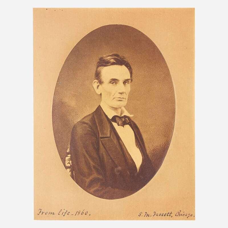 A beardless Lincoln is photographed here by S.M. Fassett in October of 1859, a year after his defeat to Stephen A. Douglas in the 1858 senate elections, and only a few months before his famous Cooper Union speech in New York City on February 27, 1860 that helped turn the tide of his political career and saw him propelled to the forefront for the presidency in the election of 1860. The negative for this photograph was destroyed in the Great Chicago Fire of 1871, and first generation photos are very rare. This image, when compared to other known first generation images, appears much more painterly, indicating a likely second generation photograph created after the original negative was destroyed. Around 1875 Fassett moved to Washington, D.C. to become photographer to the Supervising Architect of the Department of the Treasury. Mrs. Lincoln is reported as saying that this was her favorite photograph of her late husband.