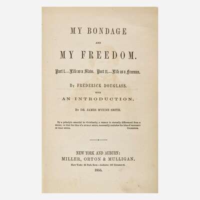 New York and Auburn: Miller, Orton & Mulligan, 1855. First edition. 12mo. 464 pp. Illustrated with an engraved portrait frontispiece of Douglass, and two engraved plates. Original blue cloth, stamped in blind and in gilt, boards, extremities, and spine faded and worn; all edges trimmed; bookseller's ticket on front paste-down; a few gatherings slightly proud; some scattered creasing. Sabin 20714; Blockson 9717