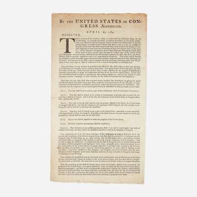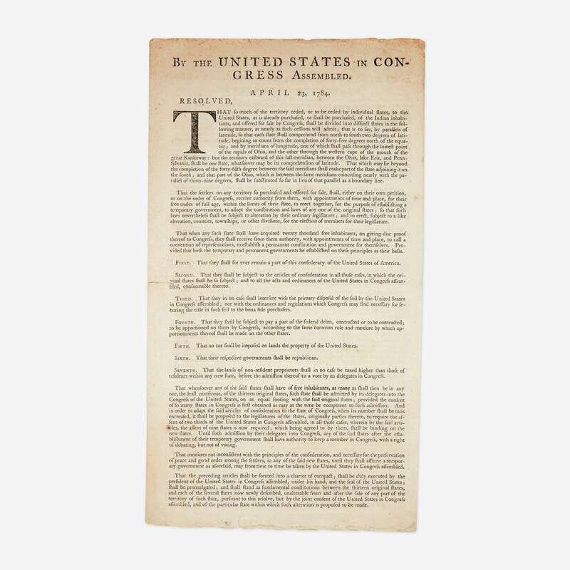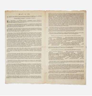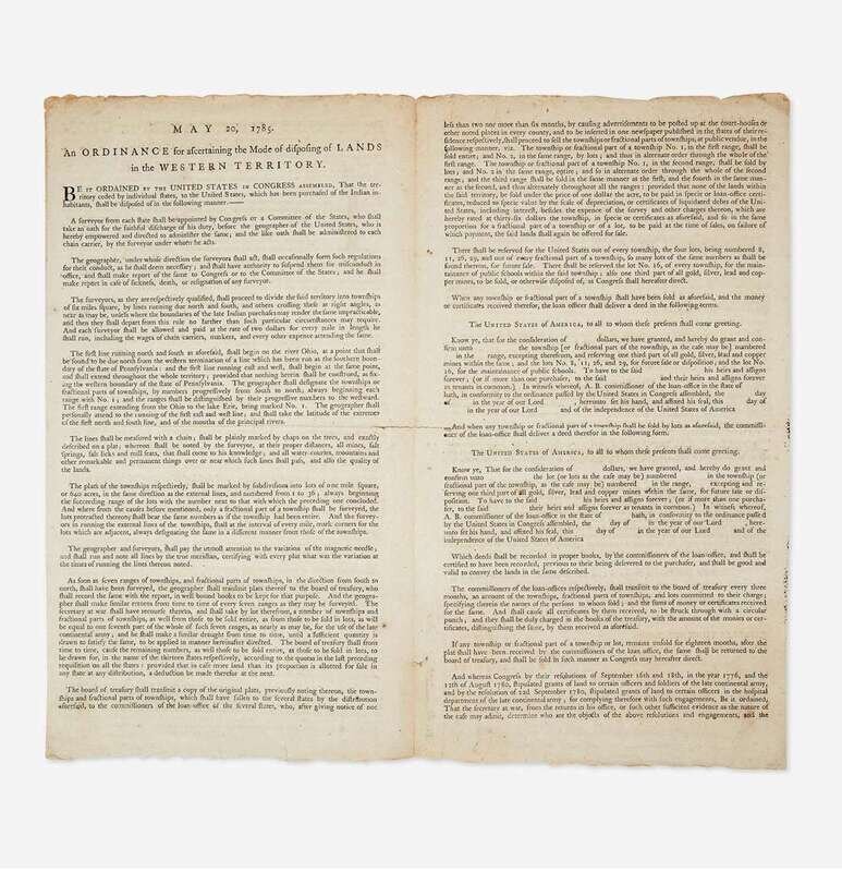 An extremely rare printing of the Land Ordinance of 1785, adopted by the United States Congress of the Confederation on May 20, 1785, one of the most significant pieces of congressional legislation and the prelude to the historic Northwest Ordinance of 1787. This landmark document set up a standardized system for the government to measure, divide, and facilitate the selling to settlers, undeveloped land in the Northwest Territory acquired from Great Britain at the end of the American Revolution (current day Ohio, Indiana, Illinois, Michigan, Wisconsin, and the northeastern part of Minnesota). The Ordinance laid the foundation for government land policy, established the basis for the Public Land Survey System, and set the stage for organized westward expansion. It was largely an extension of the Ordinance of 1784, written by Thomas Jefferson, and debated in a committee comprised of Jefferson, Hugh Williamson, David Howell, Elbridge Gerry, and Jacob Read, and passed by Congress on April 23, 1784. The 1784 Ordinance called for the development of land north of the Ohio River, its division into separate states, and the means for establishing a temporary government (printed on the first page of this document). Among the chief purposes of these Ordinances was to address Congress's need to raise much needed revenue for the government (due to its inability to levy taxes) by selling public land recently ceded to it by the individual states.