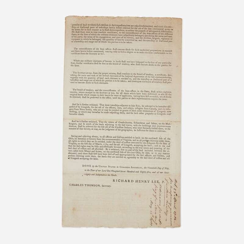 (New York, 1785). 4 pp. Bifolium sheet, 14 1/4 x 8 in. (362 x 203 mm). Printed Confederation Congress ordinance, being "May 20, 1785, An Ordinance for ascertaining the Mode of Disposing of LANDS in the Western Territory" on second through fourth pages, and with Land Ordinance of 1784 of April 23, 1784, printed in full on first page. Signed in type on page four by President of the Congress of the Confederation, Richard Henry Lee, and Secretary Charles Thomson. Fore-edge trimmed; horizontal crease from original fold, 1 3/4 in. separation traversing center of same; contemporary docketing below Lee's signature on fourth page: "Act 23rd April 1784/for temporary government/of western territory--Ordinance for dispo-/sing of western terry/May 20th 1785"; spotting in top margin; a few scattered spots. Evans 19283; ESTC W38445