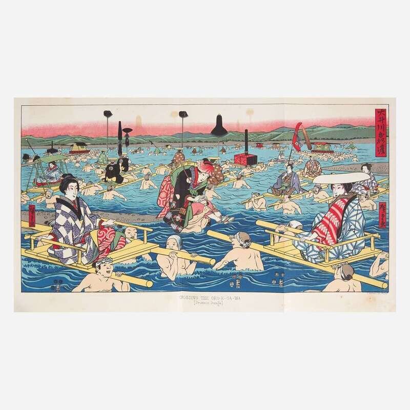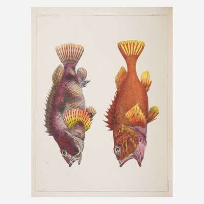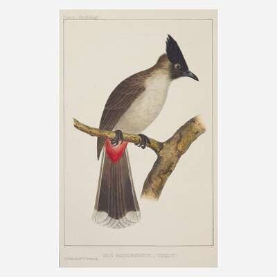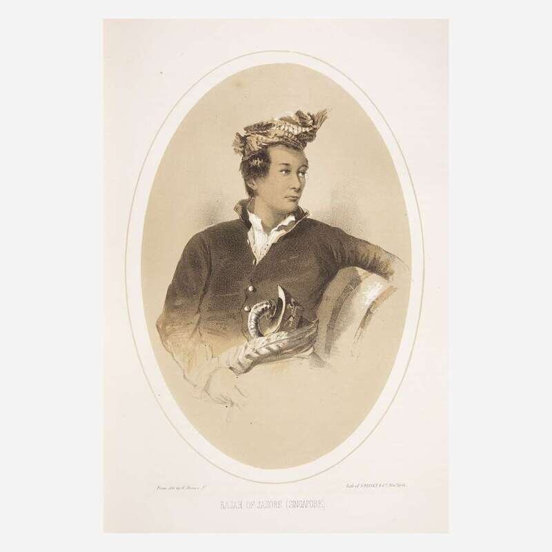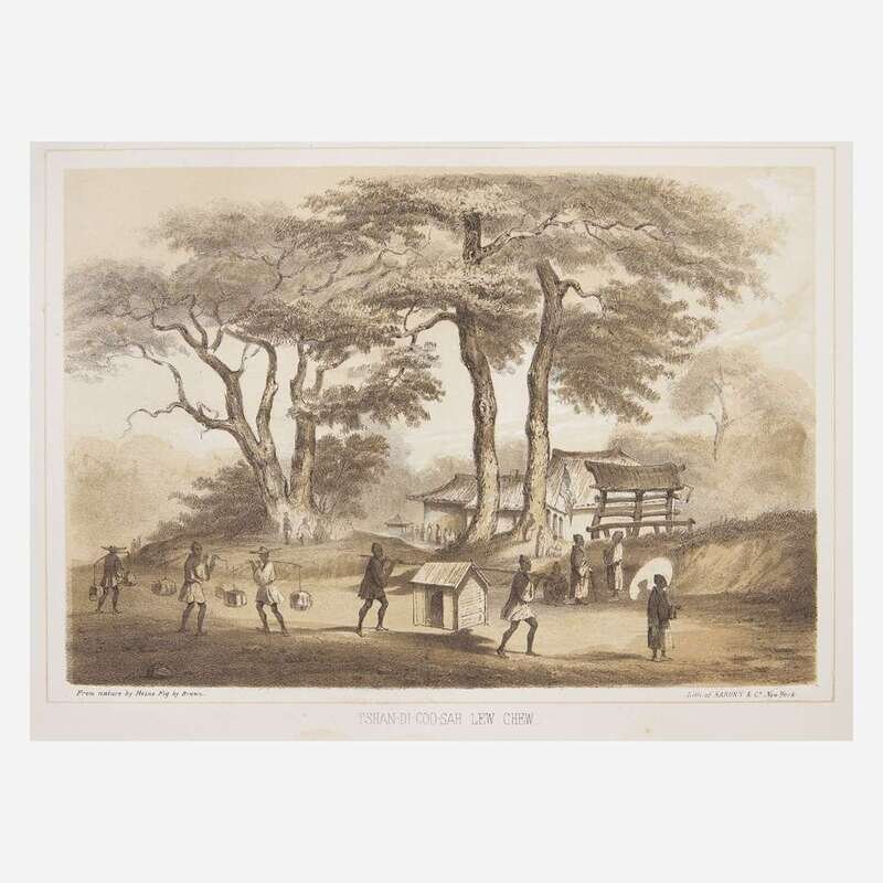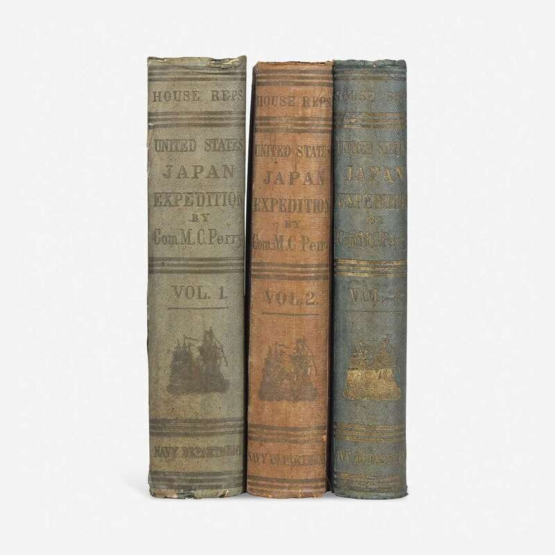 Washington, (D.C.): A.O.P. Nicholson, Printer, 1856. In three volumes. First edition, House of Representatives issue. 4to. xvii, (i), 537; (viii), 414, (18), xi, (3); xliii, (i), 705 pp. First volume illustrated with 85 (of 87) plates (many tinted), five maps (one folding), two folding plates in color, and numerous in-text wood engravings; without the suppressed public bath plate (not listed in table of plates); lacking plates facing p. 144 ("Chinese Temple, Macao") and p. 359 ("Wrestlers at Yokuhama"). Second volume illustrated with 27 lithographic plates, 16 wind and ocean current diagrams, 15 folding maps (13 large), and numerous in-text wood engravings. Third volume profusely illustrated with astral charts. Original blue and brown cloth-covered boards, stamped in blind and in gilt, gilt largely faded on each volume, boards faded and soiled; all edges trimmed; moderate to heavy foxing throughout most volumes to text and plates; scattered offsetting from plates onto text; some plate and text leaves starting in first volume; front hinge split in second volume; gift inscription from United States Representative from Connecticut Sidney Dean (1818-1901; served as House Representative from 1855-59, and received this set while in office) to O.D. Graves on front free endpaper of second volume, dated December 1856; further gift inscriptions by Graves in same, as well as other volumes, presenting this set to the Vineland Historical Society, dated March 1894. Hill pp. 230-31; Sabin 30958