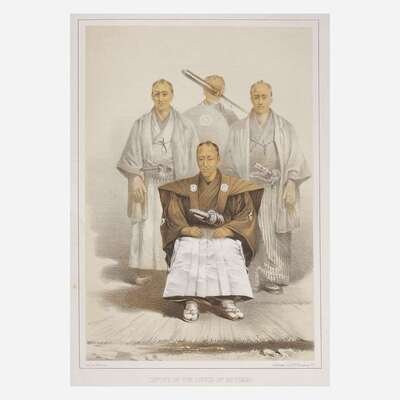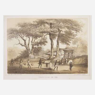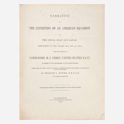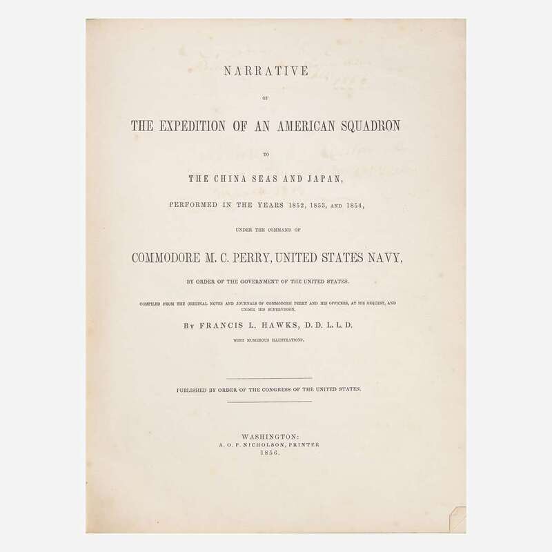 "In March, 1852, Commodore Perry was appointed commander of a naval expedition to be sent to Japan to induce their government to establish diplomatic relations with the United States. Perry felt that the only way to force Japan to cease her isolationist foreign policy would be through exhibiting superior naval forces. After entering Araga Harbor on July 8, 1853, the Japanese were eventually forced to accept a treaty that stipulated better treatment of shipwrecked seamen and permitted American ships to obtain fuel and supplies at two Japanese ports, Hakadate and Shimoda. The most important result, however, was that the visit contributed to the collapse of the feudal regime and to the modernization of Japan. Hawks, the editor of this work, was rector of Calvary Church, New York City. The Commodore, underrating his literary powers, declined to write the official report of the expedition. Instead, Hawks was engaged as editor and the two worked together in preparing the report using a number of journals written by men on the voyage..." (The Hill Collection of Pacific Voyages)
