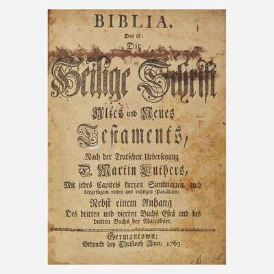 Christoph Sauer's (1695-1758) text of the Luther translation was largely based on the Halle Bible, but with the addition of the appendix to the Apocrypha with books 3 and 4 Esdras and 3 Maccabees supplied from the Berlenburg version. When first published in 1743, Sauer's bible was the first bible in a European language to be published in America and only the second Bible printed in America after John Eliot's Indian Bibles of the 1660s. The present edition, rumored to have been issued in only 2,000 copies, was printed by Sauer's son, Christoph Sauer (1722-84).