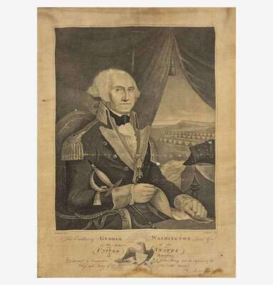 Baltimore: Ferrai & Dupin, no date (ca. 1800). Second state (of three) of the John Galland engraving. Rare stipple-engraved portrait on silk, by J(ohn). Galland, after F(rancis). Bartoli and Gilbert Stuart. Silk approximately 18 1/2 x 14 in. (470 x 356 mm). Mounted to board and edges of mat; dampstaining in bottom and right edges; scattered soiling; closed tear, just touching ruled border in upper right edge; separations and tearing in greater margin where mounted to mat. In mat and in frame, 21 1/4 x 17 in. (540 x 432 mm). Hart 789a; Baker 228; Wick 61 (David Edwin printing)