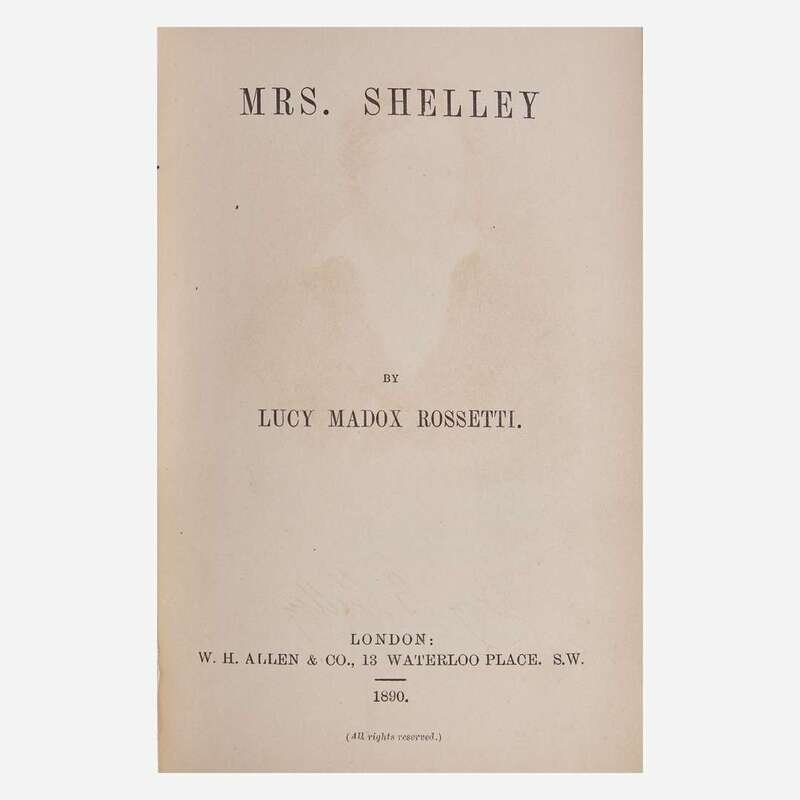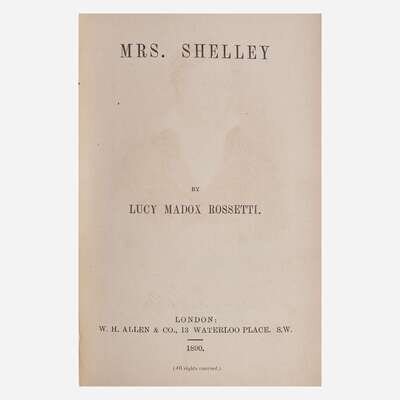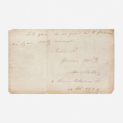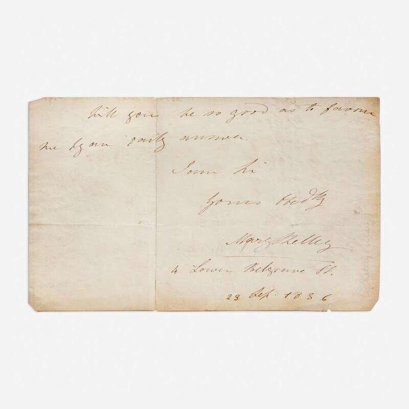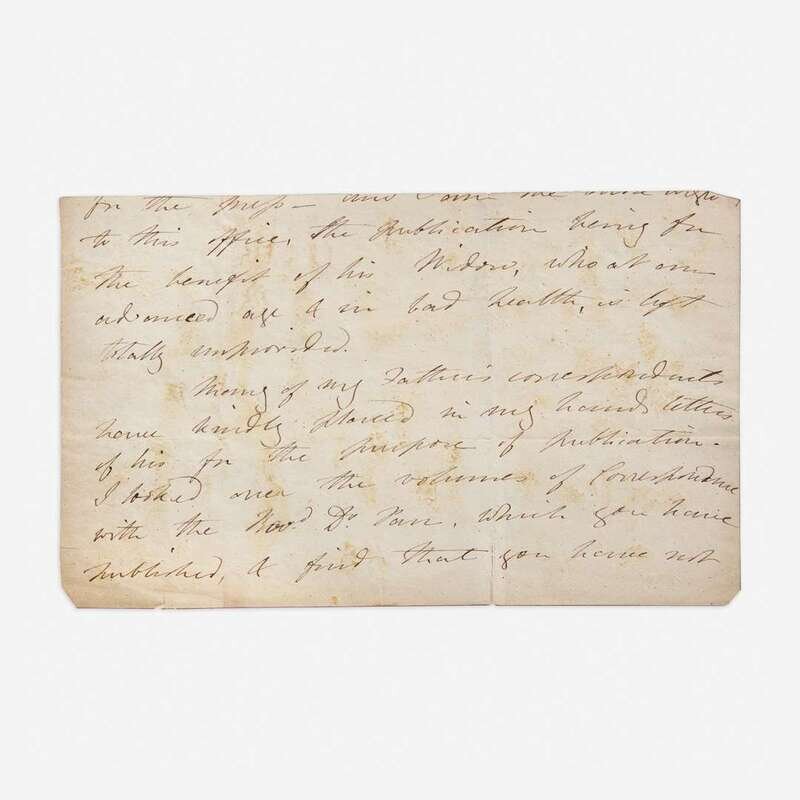 Laid in is a fragment of an apparently unpublished autograph letter, signed by Mary Shelley (1797-1851), and dated September 23, 1836. In it, she mentions her late father, English journalist and political philosopher, William Godwin (1756-1836), who had died the previous April, as well as her stepmother, Mary Jane Godwin (1768–1841). After her father's death in April 1836, at the age of 80, Mary began assembling his letters for a memoir of him for publication as he had requested in his will, but after two years of work she abandoned the project. This letter was presumably to a publisher: "...the publication being for the benefit of his Widow, who at an advanced age & in bad health, is left totally unprovided. Many of my father's correspondents have kindly placed in my hands letters of his for the purpose of publication. I looked over the volumes of correspondence with the Revd. Dr. (Samuel) Parr, which you have published..." She is possibly referring to The Works of Samuel Parr, published in 1828, which includes a selection from Parr's correspondence.