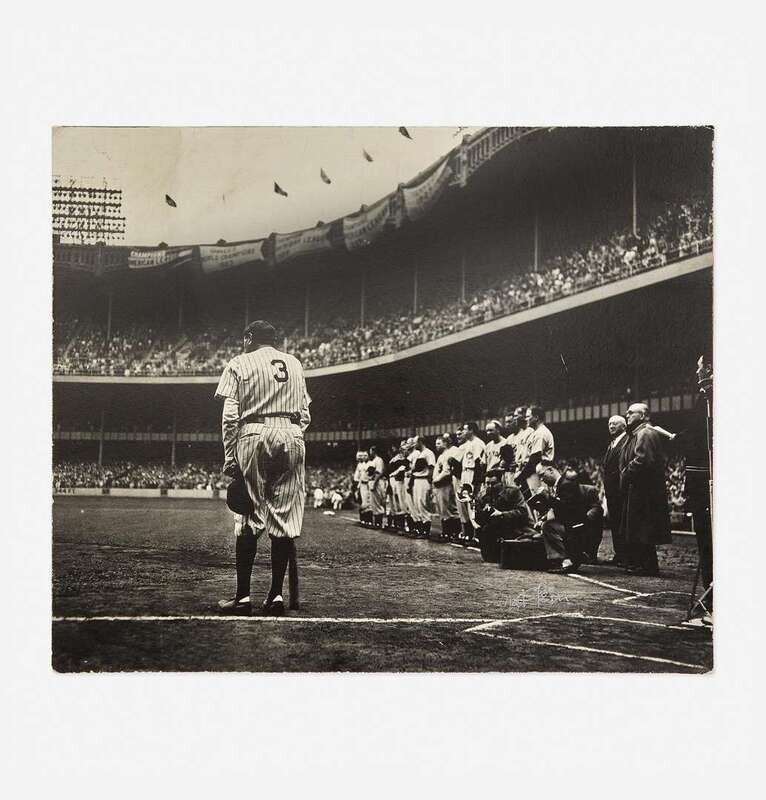 Photographed by Nat Fein on June 13, 1948, the 25th anniversary of the opening of Yankee Stadium and the day Babe Ruth's number 3 was to be retired; a frail Ruth is shown emerging for the last time from the dugout wearing his old uniform. Ruth died only two months after Fein took this Pulitzer Prize-winning photograph, on August 16, 1948. The photo originally appeared in the evening edition of the June 13 New York Herald Tribune, lost in the sports section, but the following day it was printed on the front page, leading to its recognition as one of the greatest sports photographs of the 20th-century.