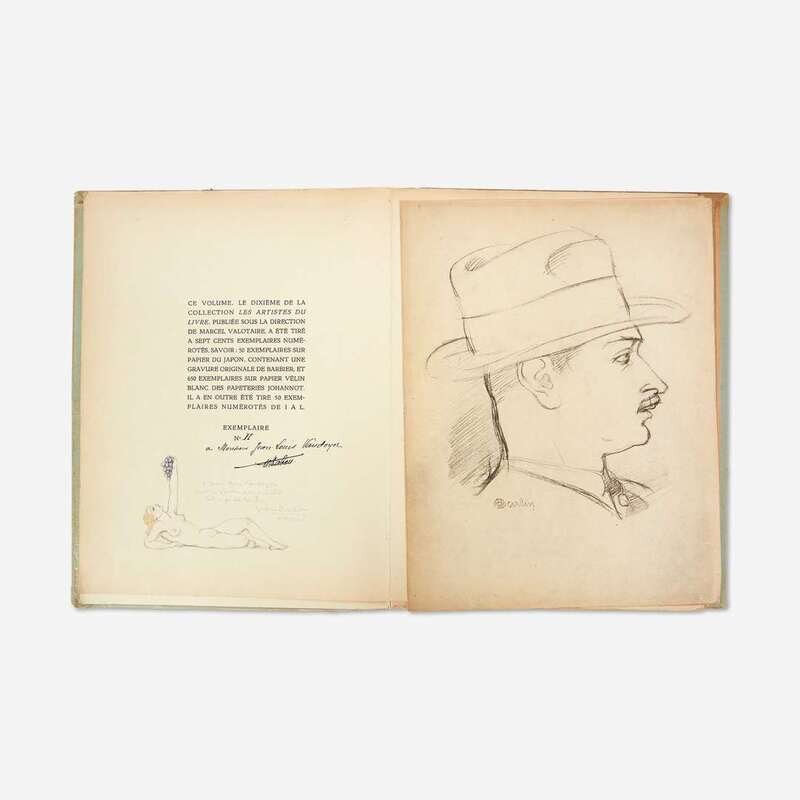 Paris: Henry Babou, 1928-33. In 25 volumes (including a duplicate of issue 20). First and limited edition, #3 of 650 sets on vellum paper (from a total edition of 700); issue 10, lettered II/L (from a total edition of 750). Complete set, comprising all 24 issues. Issue 10 inscribed by Henry Babou to French historian Jean-Louis Vaudoyer, and with an original sketch by George Barbier, and also inscribed by him to Vaudoyer; issue 15 with two prints signed by Siméon. Each issue profusely illustrated with plates (some in color), a portrait of the artist, a facsimile letter, and numerous in-text illustrations. Original stiff printed paper wrappers, each with original glassine, scattered wear and soiling; each in original printed paper-board portfolios, most ties intact (issues 9 and 10 ties perished, issue 22 ties partially-perished); scattered chipping and loss to spines, most boards browned along edges; duplicate copy of issue 20 without portfolio.