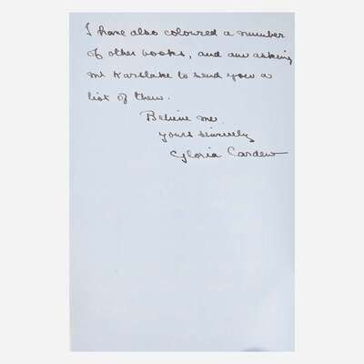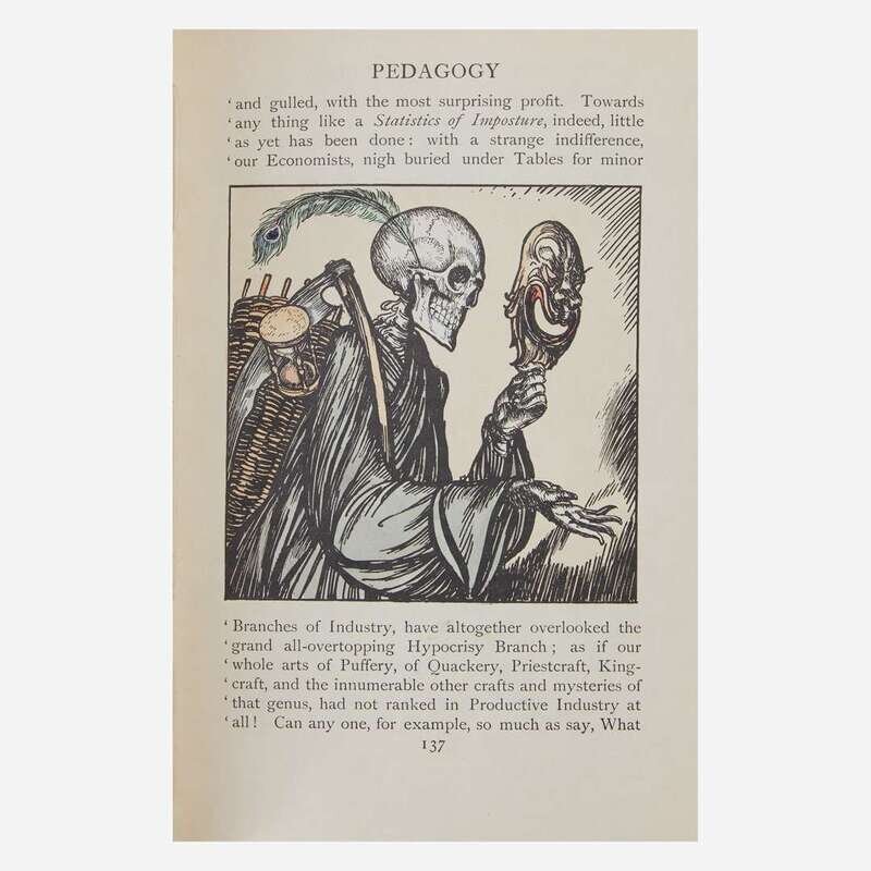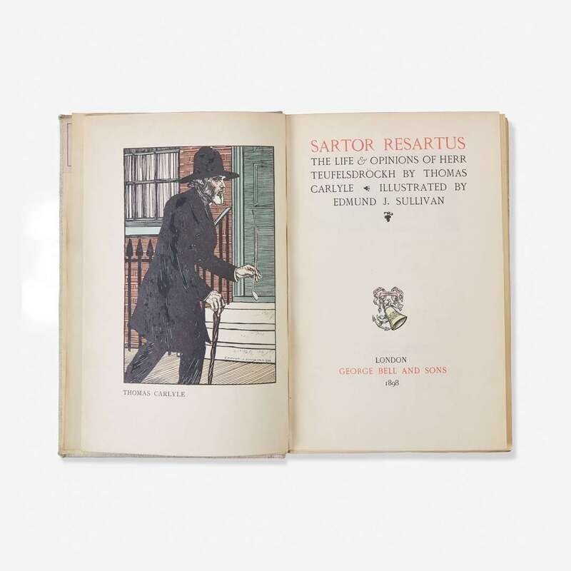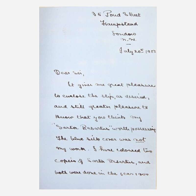 In her letter, Cardew points out that she completed the coloring of this copy of Sartor Resartus in 1900. She also references Frank Karslake, the bookseller responsible for forming The Guild of Women-Binders. It was Karslake who came up with the idea of adding value to a book by way of artists such as Cardew adding color to the illustrations. The hand-coloring was no doubt time consuming but created an undeniable effect to the work. Three years before completing this copy Cardew had 32 books with her handiwork in an exhibition organized by Karslake. Few examples of Cardew's work seem to survive. Rare.