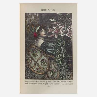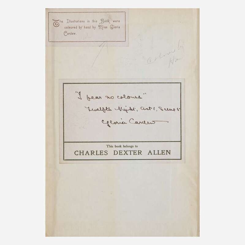 London: George Bell and Sons, 1898. First and limited edition thus, #7/150 numbered copies printed on Japanese vellum and including one additional illustration. 8vo. xxiii, (352) pp. Profusely lllustrated by Edmund J. Sullivan. This copy beautifully hand-colored by Gloria Cardew (one of two copies colored by her). From the library of Charles Dexter Allen, author of American Book-plates: A Guide to Their Study with Examples, 1894, and with his book-plate on front paste-down with a MS. quote from Shakespeare in the hand of Cardew. Additionally, an A.L.s by Cardew, presumably to Allen, referencing the book-plate among other things, tipped in. Publisher's binding of oatmeal buckram, stamped in black and red; top edge trimmed, other edges untrimmed.