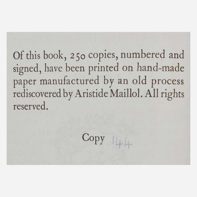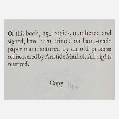 Paris: Philippe Gonin for A. Zwemmer, London, 1937. First and limited edition, #144/250 numbered copies signed by Maillol. 12mo. Text in English (also printed in French and in German). Illustrated with woodcuts by Aristide Maillol. Original full vellum, titled in gilt; top edge trimmed, other edges untrimmed; in linen-covered leather-entry slip case. The Artist and the Book 174