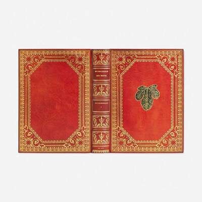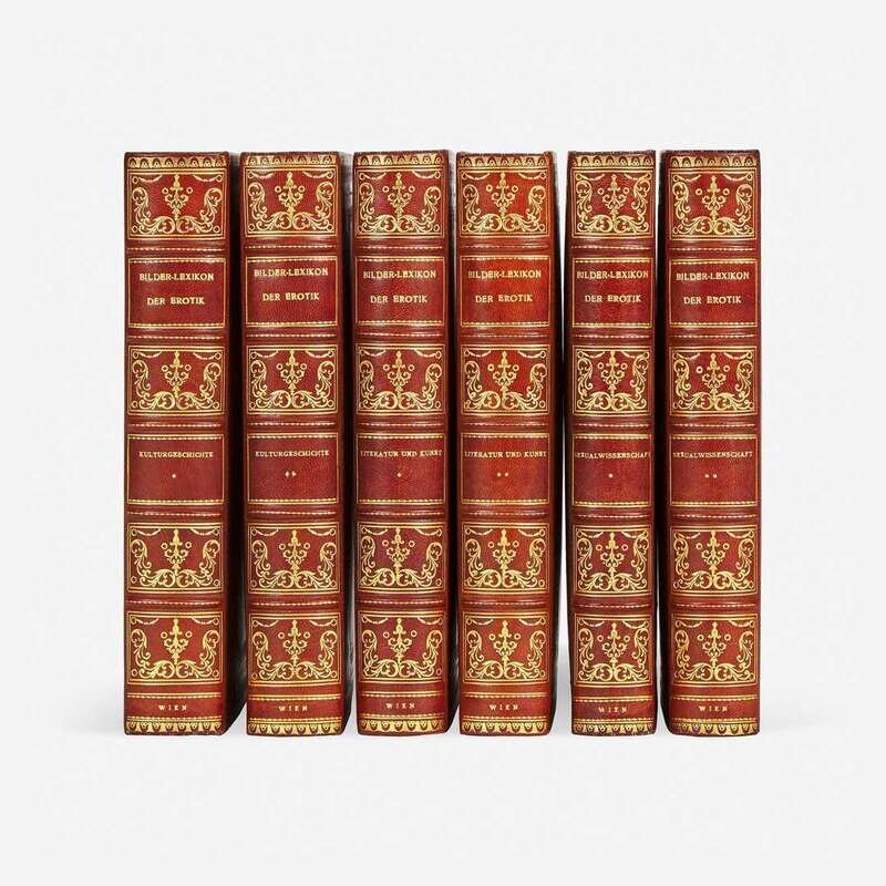 Wien and Leipzig: Verlag fur kulturforschung, (1928-30). In six volumes (three titles bound in two volumes each: Kulturgeschichte, 1928; Literatur und kunst, 1929; Sexualwissenschaft, 1930). Large 8vo. Profusely illustrated in color and in black white. Bound in full tan niger, elaborately gilt, with tan crushed niger inlay, with green leather fig leaf inlay in same, on front board of each volume; marbled endpapers; top edges gilt, other edges trimmed; in three cloth-covered slip cases; by Bennett. A fine set.