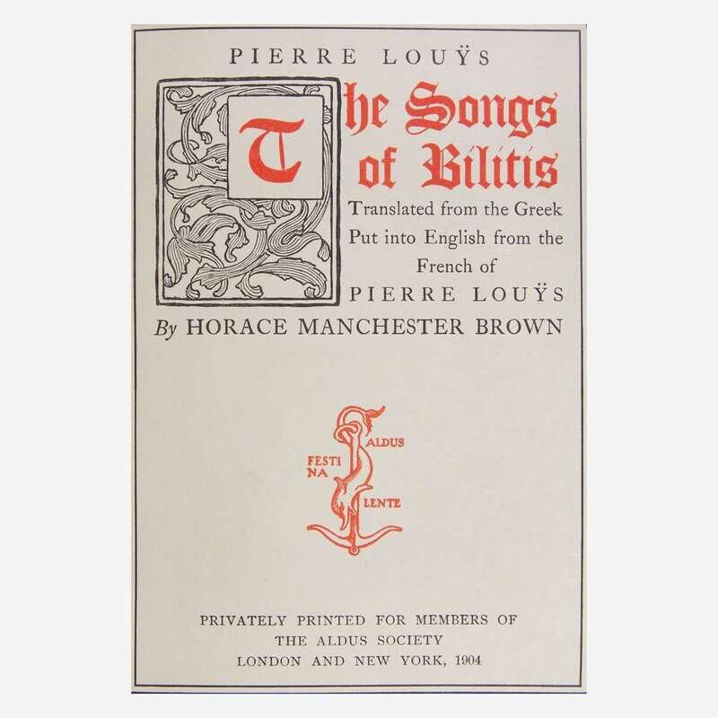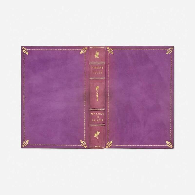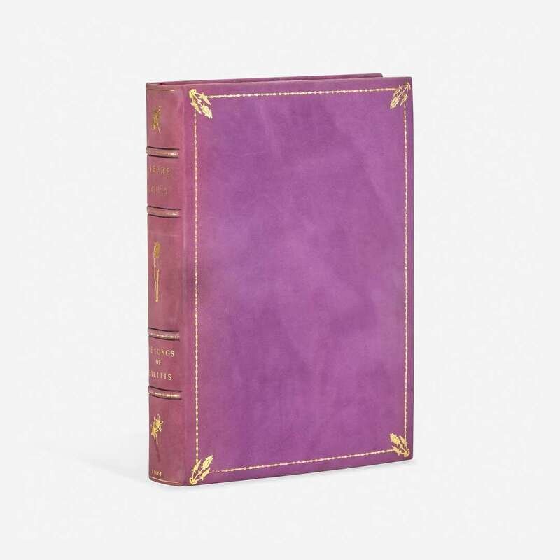 London and New York: Privately printed for members of the Aldus Society, 1904. First and limited edition thus, #725/971 numbered copies of the Edition de Grande Luxe (from a total edition of 1,000). 4to. 341 pp. Translated from the French of Louys (who himself translated the Greek of Bilitis) by Horace Manchester Brown. Frontispiece portrait of Louys by James Fagan. Bound in full purple reverse calf, decorated in gilt, spine slightly faded; decorated endpapers; top edge gilt, other edges untrimmed; enclosed in a leather-entry linen slip case and chemise; by Bennett. A fine copy.