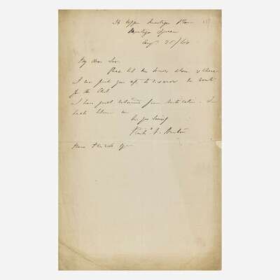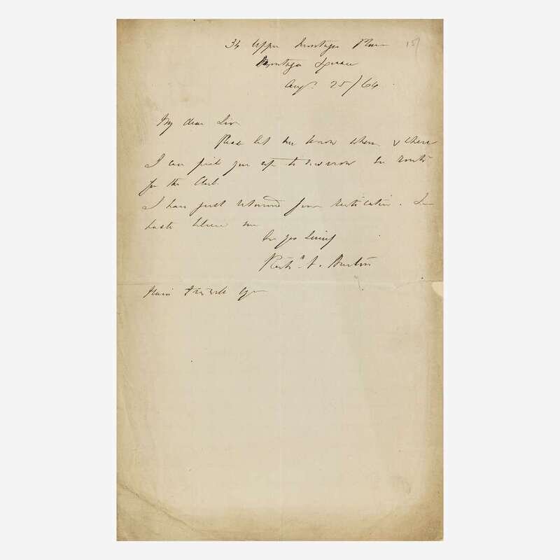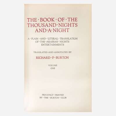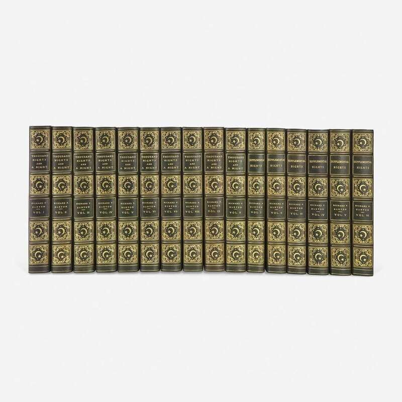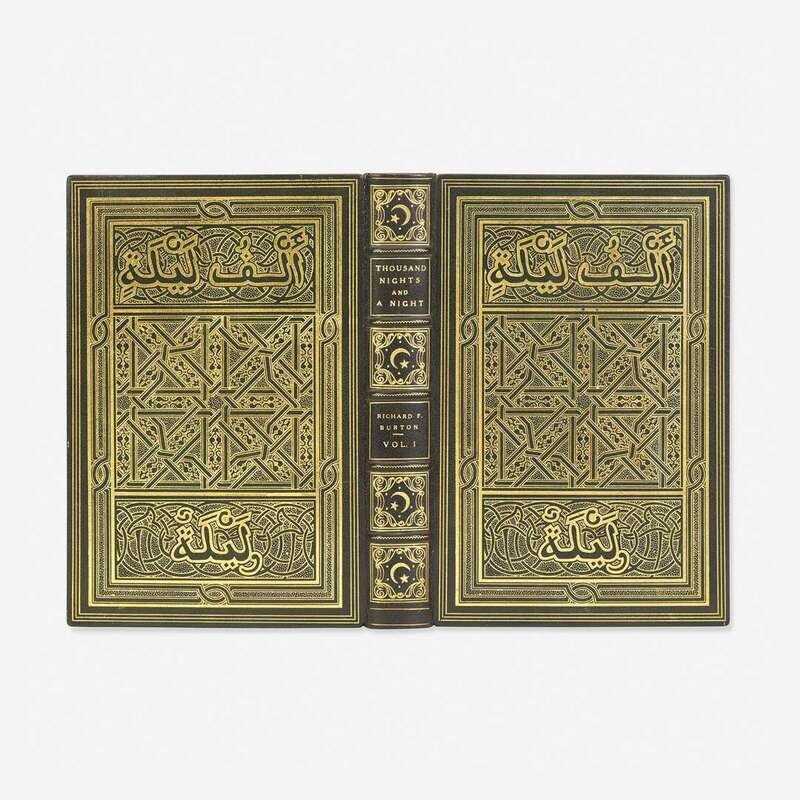 No place: Privately printed by the Burton club, no date. In 16 volumes (ten volumes of the Thousand Nights and a Night and six volumes of Supplemental Nights). Limited edition, #50/150 sets of The Manuscript Edition, including a 12-line tipped-in autograph letter, signed by Burton and dated August 25, 1866. Illustrated in color and in black and white. Frontispiece in first volume in two states (one in color, one in black and white), frontispieces in other 15 volumes in one state. Bound in full blue-green morocco, elaborately stamped in gilt; marbled endpapers and doublures; top edges gilt, other edges untrimmed (some pages unopened). Although unsigned, the binding is possibly a deluxe edition of the set as an identical binding has been seen by this cataloguer in two other instances. Not in Penzer.
