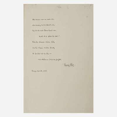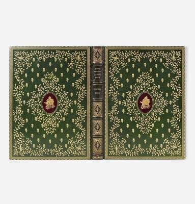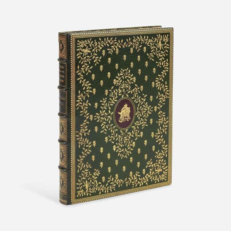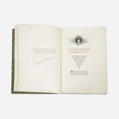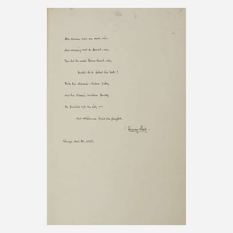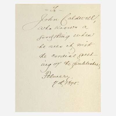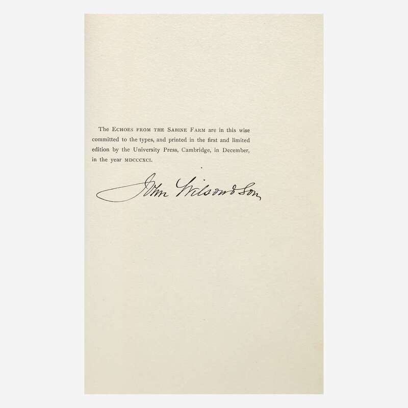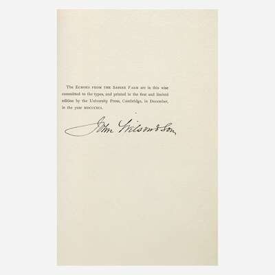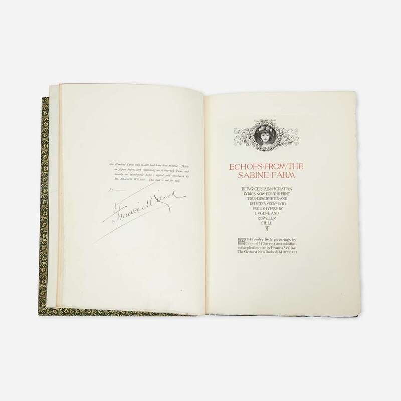 New Rochelle: Francis Wilson The Orchard, 1891. First and limited edition, one of 70 copies (from a total of 100) printed on hand-made paper and signed by the publisher, this copy unnumbered. Wilson's book-plate mounted on inserted blank. Inscribed by Wilson to John Caldwell, February 7, 1895, on blank in front. Uncalled for MS. poem signed by Field completely in his own hand, dated October 21, 1895, bound in at front (30 copies of this edition were printed on Japan paper and each included a MS. poem). Signed by printer John Wilson & Son on colophon in rear. Title-page and initials printed in black and red. Illustrated by Edmund H. Garrett. Bound in full green morocco, elaborately gilt, spine slightly darkened and gilt slightly dulled, and with purple leather onlay on front and rear boards; top edge gilt, other edges untrimmed; original covers bound in at rear; in leather-entry slip case; by The Club Bindery. A fantastic copy. BAL 5744