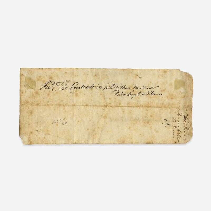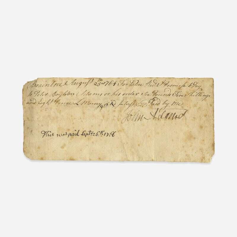 Braintree, (Massachusetts), August 25, 1764. 3 3/8 x 7 5/8 in. (85 x 193 mm). Promissory note, in a secretarial hand, to Peter Boylston Adams, younger brother of second president John Adams, for the sum of ten shillings and eight pence; annotated by John Adams at bottom: "This was paid Sept 26th 1766", also annotated by Peter on verso. Creased along center from original fold; scattered spotting. Lot includes an engraved portrait of Adams.