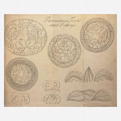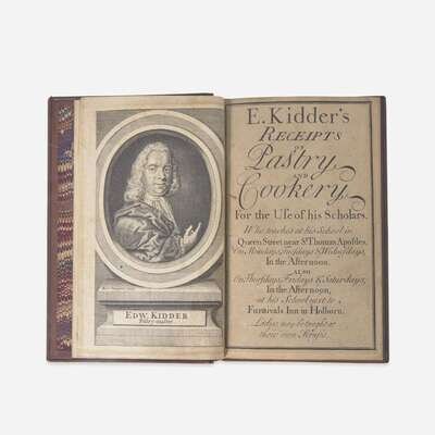 (London, ca. 1720-30s). First edition (with "Queen Street near St. Thomas Apostles" on title-page, includes sheet K2, including plate "Lamb Pastey...", printed text running through signatures at bottom of plates F2 and H1, and without "fins" on index leaf). 8vo. Comprising an engraved frontispiece portrait of Kidder by Robert Sheppard, engraved title-page, 40 leaves of engraved recipes (printed on rectos only), engraved leaf "The Order for Bills of Fair" (printed on recto only), engraved index leaf (printed on recto only), and eight engraved plates (three folding); lacking ad leaf as called for in Bitting, as usual. Full polished brown calf, stamped in blind and in gilt, morocco spine label, ownership initials stamped in blind on front board; edges stained red; marbled endpapers; headline of L2 shaved close. Bitting 259; ESTC T92423 and T92424 (though likely misdated, as per other copies that have been offered on the market).