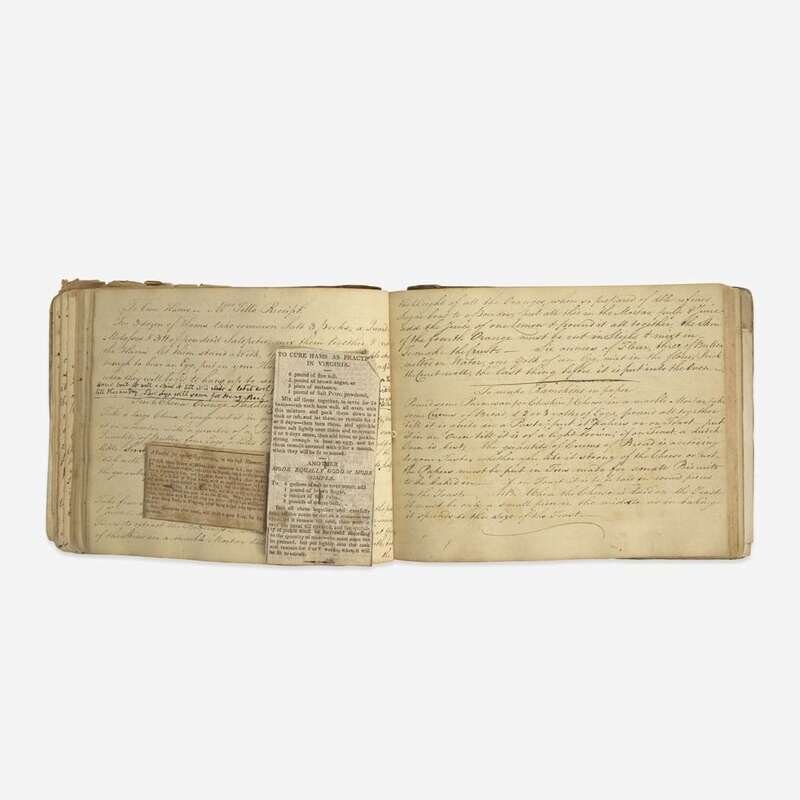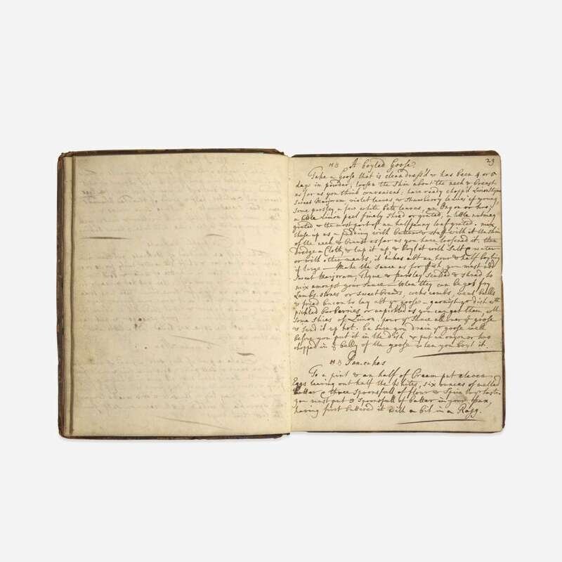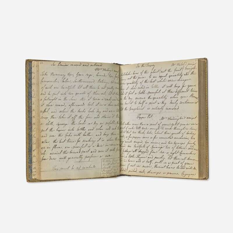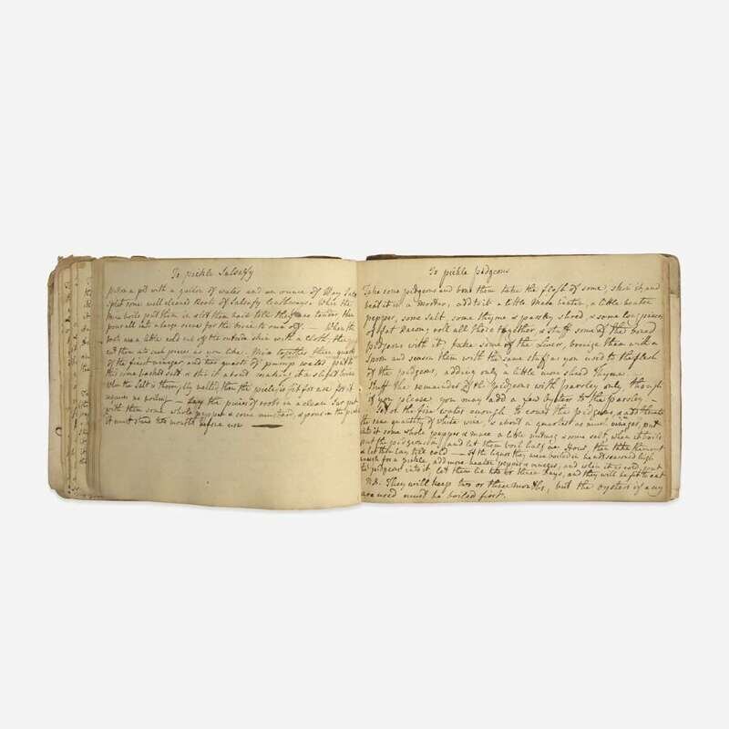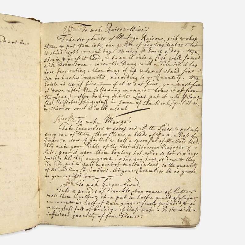 An interesting collection of early eighteenth and nineteenth century manuscript recipe books, in numerous hands, featuring dozens of recipes, including different pickling and curing methods ("To pickle walnuts", "to pickle mushrooms", "to pickle oysters", "to cure ham", "to pickle pidgeons"), types of preservation ("to preserve peaches in brandy"), numerous recipes on making different types of alcoholic drinks, including beer ("to brew half a Barrel of small malt beer", "persimmon beer") and wine (ginger, elderflower, orange, raspberry, etc.), as well as recipes on baking and other types of sweets ("cream cakes", "to make muffins", "to make a chocolate tart", "to make a cream cheese", "for Gingerbread"), and preparing different types of meat ("to make a Ham ye Yorkshire way", "to hash Mutton", "a Marinade of Rabbits or Chickens"). Some medicinal recipes are found throughout each volume ("for a putrid fever", "For the Dropsy", "Green ointment for bruises", "For a Horse's cold") as well as instructions to make various household and dry goods ("to make fine Ink", "to kill rats", "to Black Shoes or Boots").
