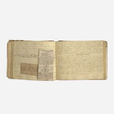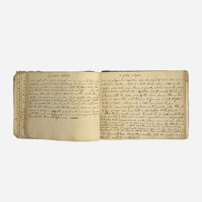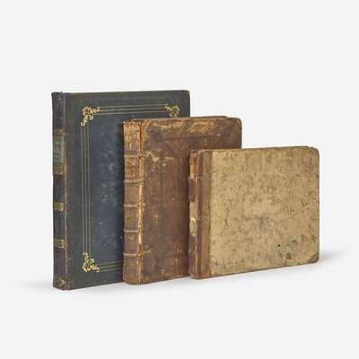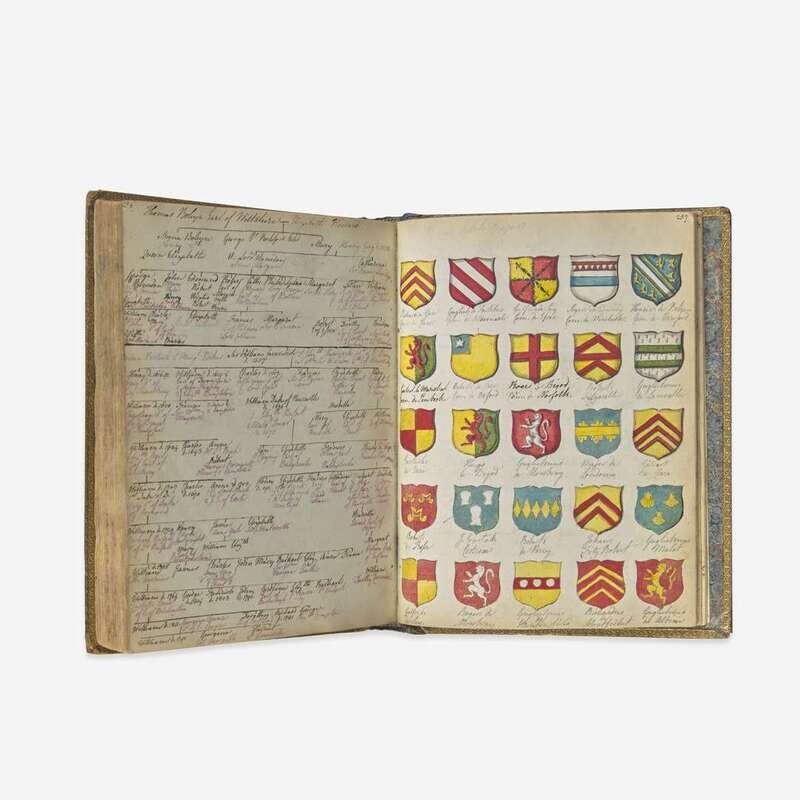 English, ca. early 18th-19th centuries. In three volumes. Sizes vary. Comprising dozens of MS. recipes across three volumes, in numerous hands. One volume includes extensive histories of important Royal and British family lines, with numerous original hand-colored drawings of coats of arms. Bindings vary, some boards detached or starting; scattered wear and soiling throughout each volume; numerous pieces of ephemera laid in.