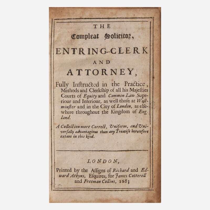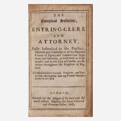 First published in 1666 or 1668, this scarce 1683 second edition is a practical guide for attorneys in the various English Courts, and is "concerned with the process of the different courts, with the instructions as to the manner and time of taking the various steps in an action, with the forms of pleading, with the modes of executing judgment, with the fees payable at the different offices of the courts, with the forms of conveyances and other documents which clients would be likely to need." (Sir William Searle Holdsworth, A History of English Law, Volume 6, 1924, p. 437). We can locate only 15 institutional copies, and this is the first copy to be offered at auction since 1940.