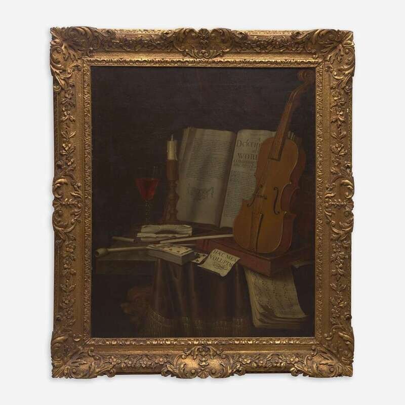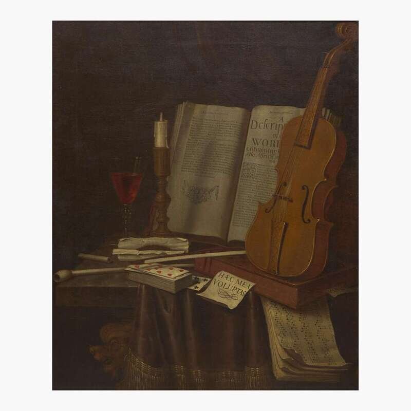 Edward Collier (Dutch, B.C. 1640–D.C. 1706) A Tabletop Still Life with Violin, Music Sheets, Tobacco, Smoking Utensils, Books, Wine and Candle (Vanitas)