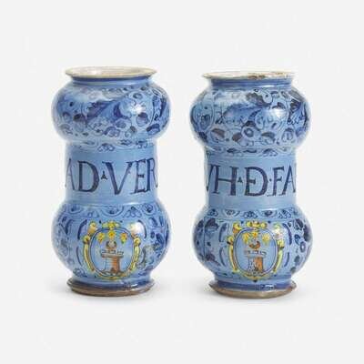 A Pair of Italian Tin-Glazed Earthenware 'Berrettino' Armorial Albarelli Venice, first half 16th century