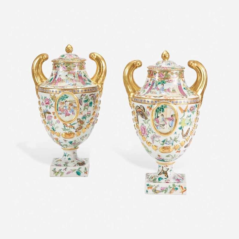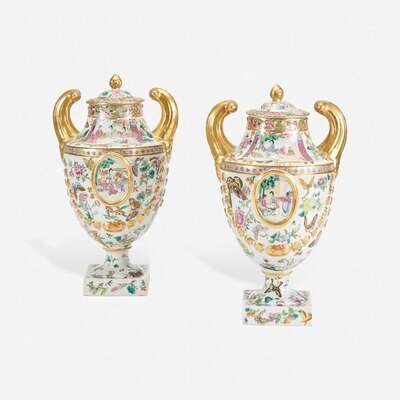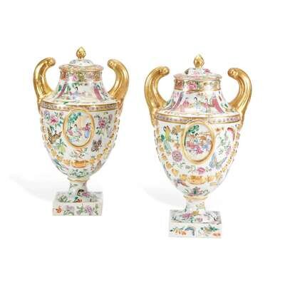 A Pair of Chinese Export Porcelain Famille Rose Pistol-Handled Urns and Covers early 19th century