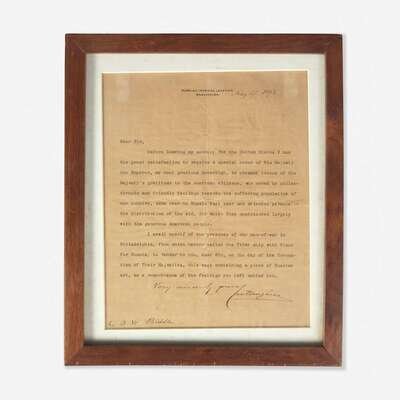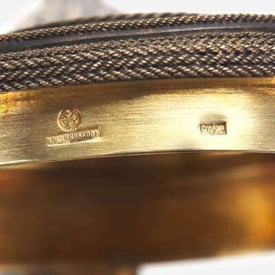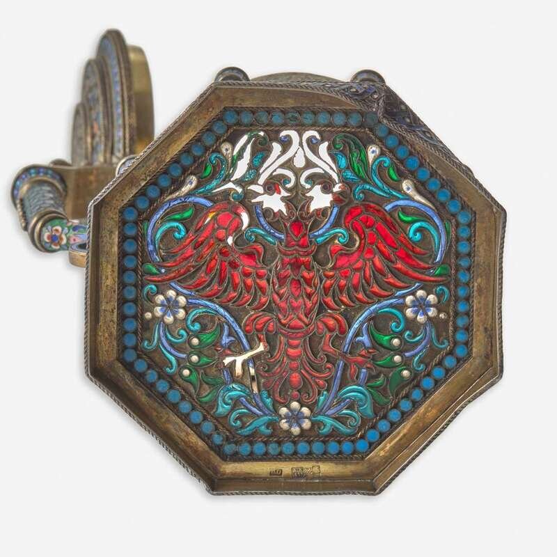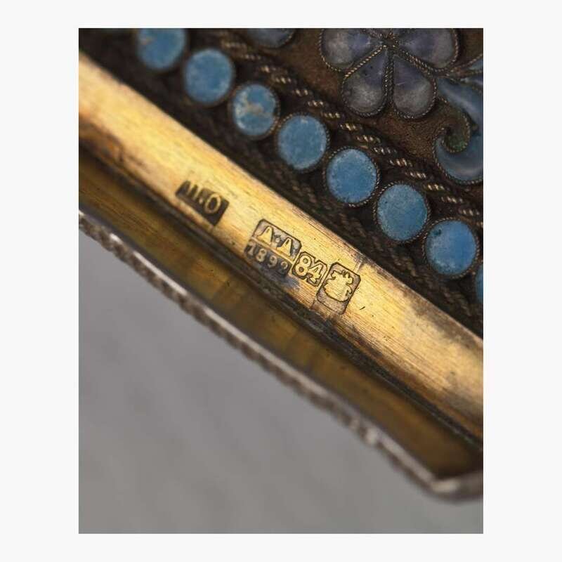 The lid marked for Pavel Ovchinnikov with standard mark of 84 and St. George for Moscow 1861-96, the base marked with 'NO' for Pavel Ovchinnikov and assay mark for Anatoly Apollonovich Artsybashev, 1892, sold together with a letter dated May 27, 1893, from Prince Cantacuzène on behalf of Tsar Alexander III on letterhead from the Russian Imperial Legation, Washington DC, dated May 27, 1893, to A.W. Biddle.