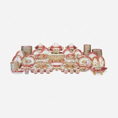 The maroon ground encompassing central floral decoration, some pieces with fruit, ornithological, or portrait motifs as noted; comprising: twenty-eight each dinner plates and luncheon plates (nine with fruit motif); eighteen bread and butter plates; sixteen each saucers (each marked ‘Rihouet a Paris’) and rimmed soup bowls; thirteen flat cups (each marked ‘Rihouet a Paris’); seven oval platters of four sizes; two each open oval vegetable dishes (marked ‘Fabrique pour W.J. Kerr Philadelphia’), relish dishes, footed double-lipped sauceboats on fixed underplates, footed compotes (one with fruit motif, the other with ornithological motif), covered circular footed tureens, covered footed sauce tureens on fixed underplates (one with ornithological motif), reticulated footed fruit baskets on reticulated stands (one with fruit motif), oval footed vegetable dishes (one with cover, the other without); and one each reticulated footed oval centerpiece bowl on reticulated stand, covered tureen, circular footed bowl, handled basket; sold together with six associated butter pats (with portrait motif). (approx. 155).