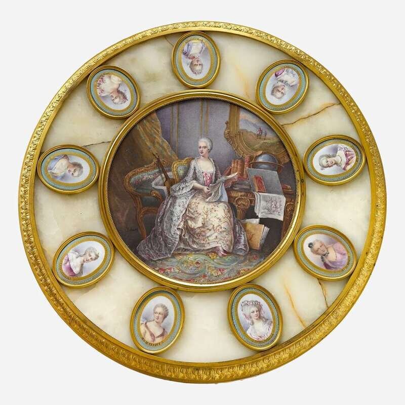 The circular top inset with a large circular plaque painted to show an 18th century lady at a desk reading music, signed 'P. Juéry' within gilt bronze border, surrounded by nine smaller oval portraits of noble ladies, each titled beneath the image, the cylindrical column mounted within three large acanthus scrolls united by floral swags raised on tripartite base with inset guilloche frieze, on castors.