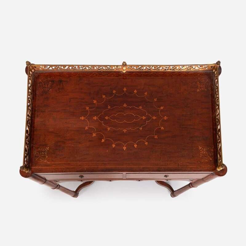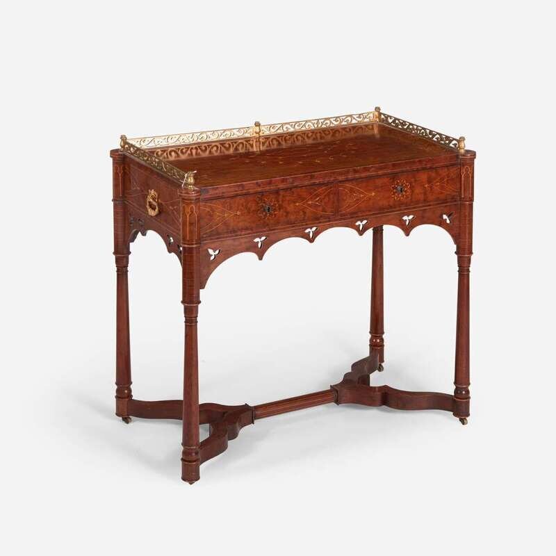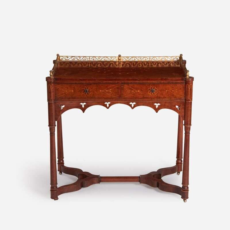 With gothic inlay and shaped apron, two drawers, pierced ormolu gallery and handles, turned legs with H-form stretcher, on brass casters.