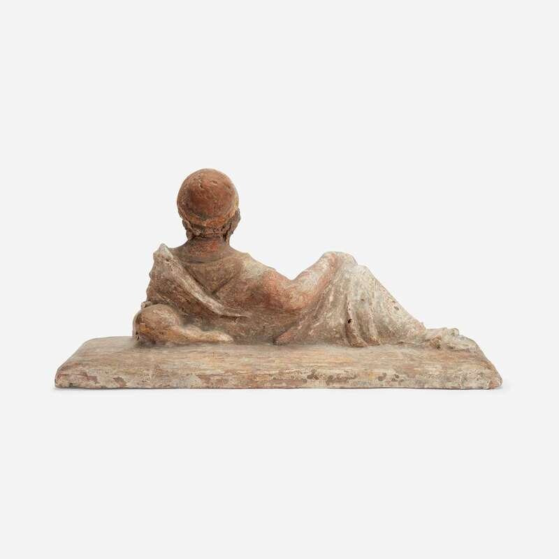 Painted terracotta, depicting a lady of fashion in recumbent pose, her left arm with jeweled hand rests on a pillow, the right holds a domed libation bowl, the elegant folds of drapery largely concealing her form, the full neck leading to a face with delicately defined feature and painted detail, the curled hair tied by a chignon.