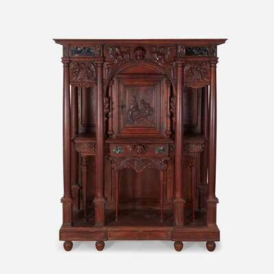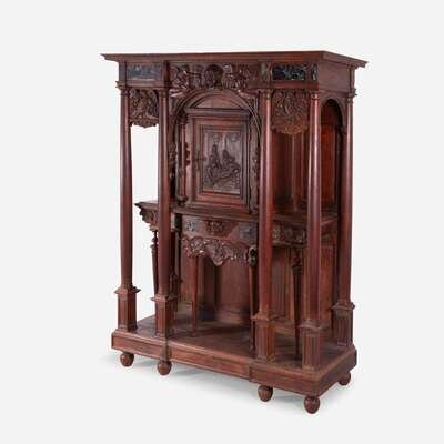 The center cupboard door with carved bas relief scene of the myth of Diana and Actaeon, the case inset with vert antique marble.