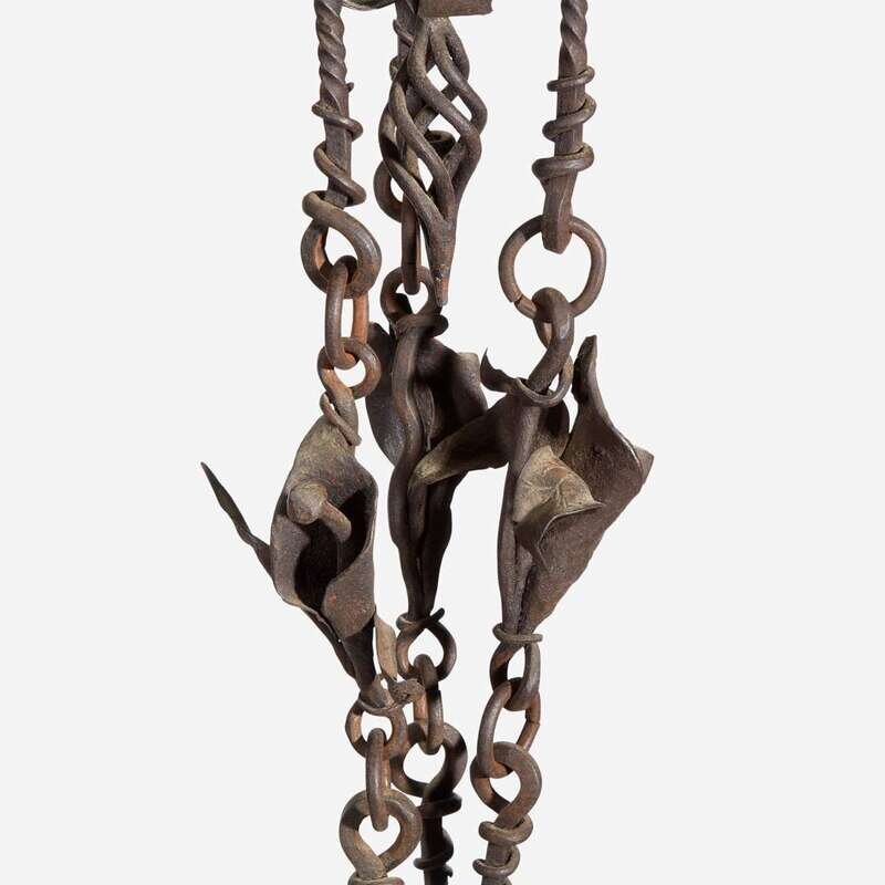 Each light with prick candlestick, the links and circulet decorated with foliate forms including lilies and ivy tendrils, the circulet suspended from a fleur-de-lis crown-form corona