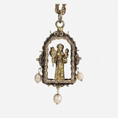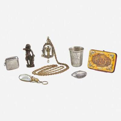 Comprising an Italian Renaissance bronze figurine of Cupid, with shield inscribed 'QUIS UT DEUS;' a brass pendant of Saint Francis of Assisi on a chain, possibly Flemish, 15th century or later; a Continental silver armorial beaker, engraved with armorial and scene of a couple above 'SILENTIUM', possibly18th century, undertemined maker's marks; a George VI sterling silver matchbox, unidentified maker's mark, Birmingham, 1938; a silver oyster-form vinaigrette, apparently unmarked; a brass-mounted mother of pearl perfume, apparently unmarked; and a tortoiseshell card case decorated with pastoral scene. (7).