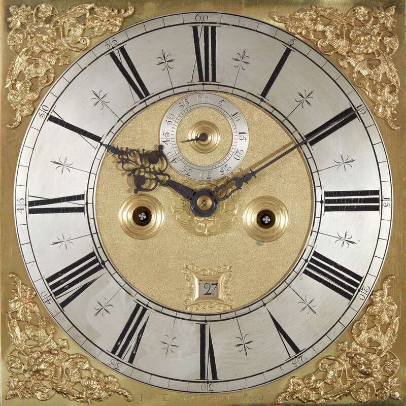 The brass face signed 'John Ebsworth Londini Fecit,' the movement with minute and second hands and date aperture.