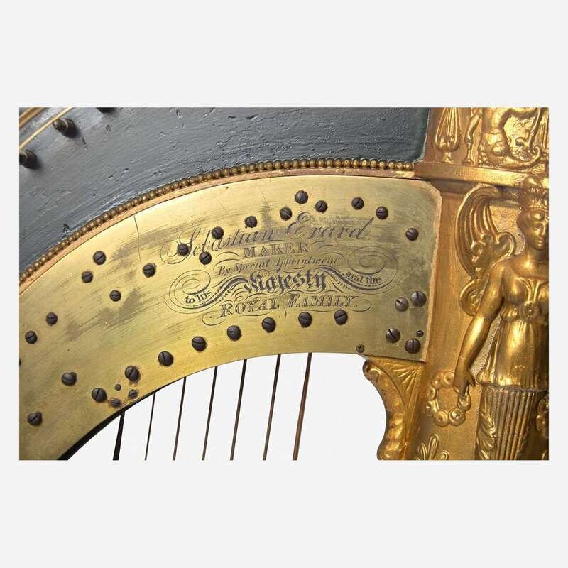With brass mount inscribed 'Sebastian Erard/Patent No. 4227/18 Great Marlborough Street, LONDON' with a variant of the royal coat of arms of the United Kingdom to one side, 'Sebastian Erard/MAKER/By Special Appointment/to his Majesty and the/ROYAL FAMILY' to the other.