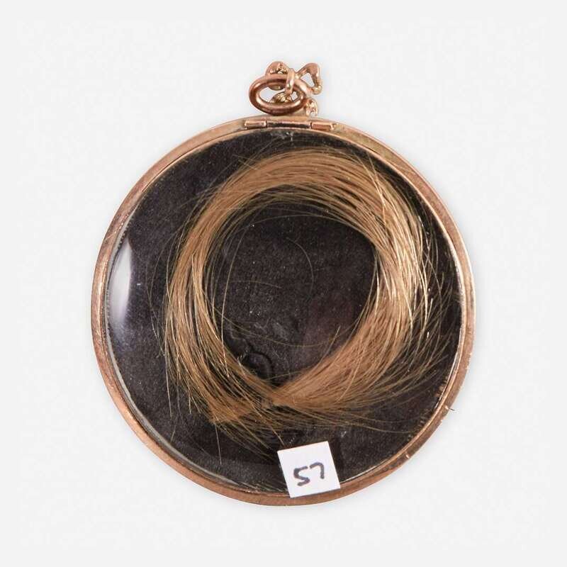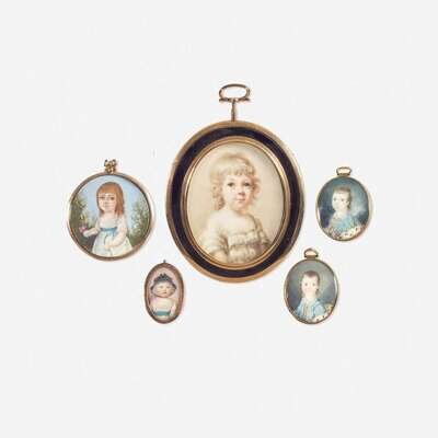 Comprising a pair of portraits of young boys in blue jackets, School of Edward Vaughn (English, active 1772-1814), gilt locket cases; a memorial portrait of a young girl in a white dress with blue sash, holding roses, English School, circa 1800, with gilt case, silk backing with hairwork; a portrait of a young child wearing a white dress with blue sash, bonnet, and a black hat, English School, early 19th century, gilt locket case; and a portrait of a young girl with blond hair, English School, late 18th century, enamel and gilt locket case, verso with aperature containing woven hairwork; all watercolor.