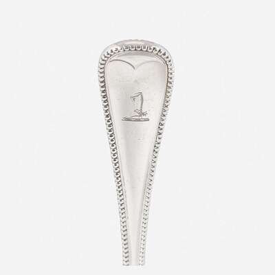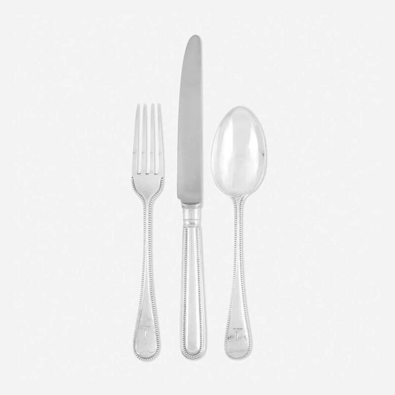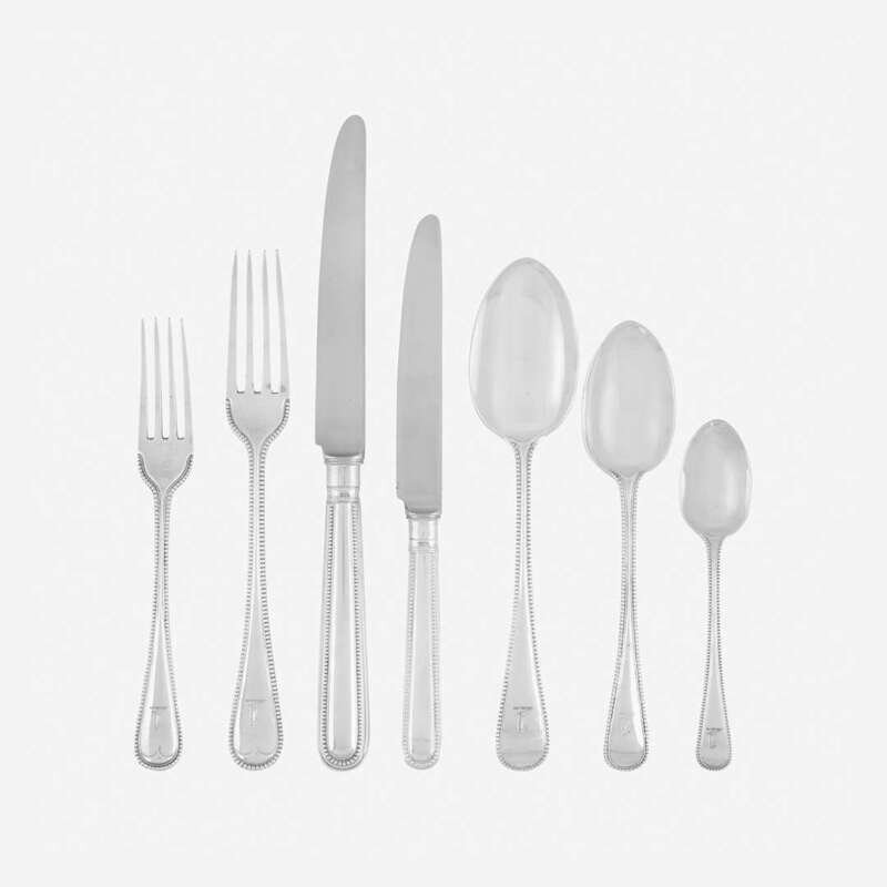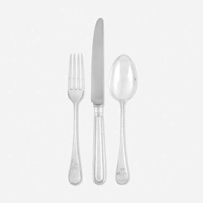 In the ‘Old English Bead’ pattern and double struck, comprising twelve each table forks, dessert forks, steel-bladed dinner knives, steel-bladed luncheon knives, dessert spoons, tablespoons of two sizes; one each sauce ladle, soup ladle, gravy spoon; together with ten teaspoons, marked George William Adams, London, 1886; the knives later replacements marked C.J. Vander Ltd., Sheffield, 1982; all engraved with armorial spurred boot to handle, sold together with two custom-fitted cases. (approx. 85)
