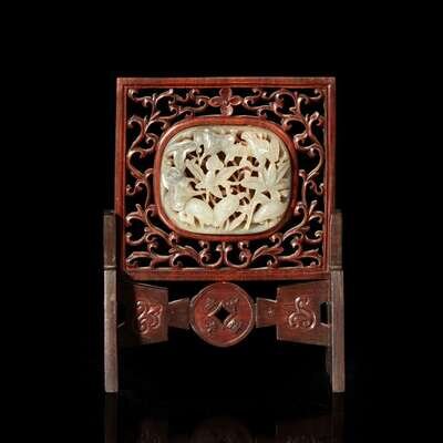 The jade plaque reticulated with four waterbirds among lotus blossom and leaves, the jade of greyish white tone with dark grey speckling; the later wood stand carved in openwork with scrolls.