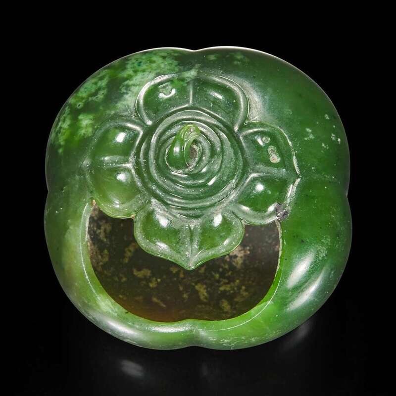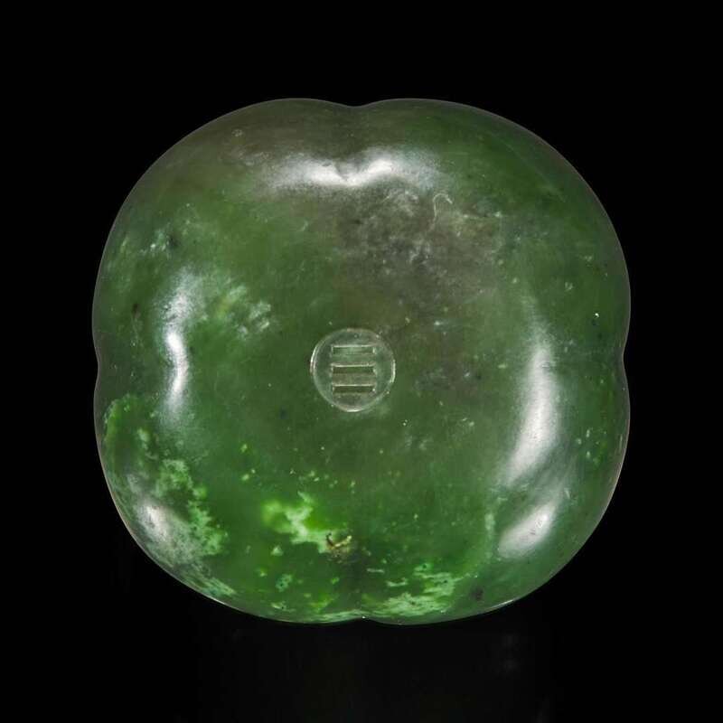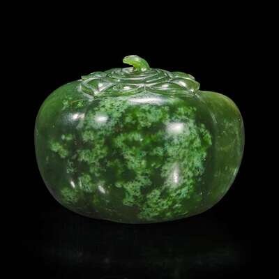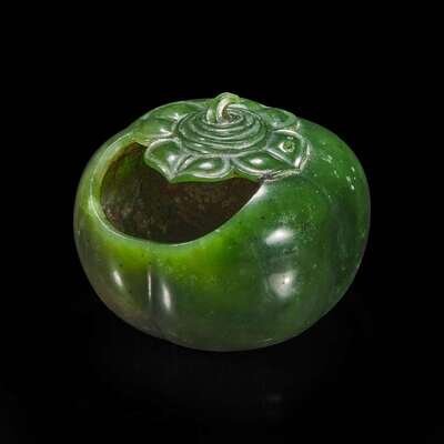 The water coupe carved with as a hollowed persimmon with four lobes and topped by its stem, the top with insect nibbles; aperture on one side of the top, "qian" mark to the underside, the stone of a rich green tone with a few dark specks and areas of paler inclusions.