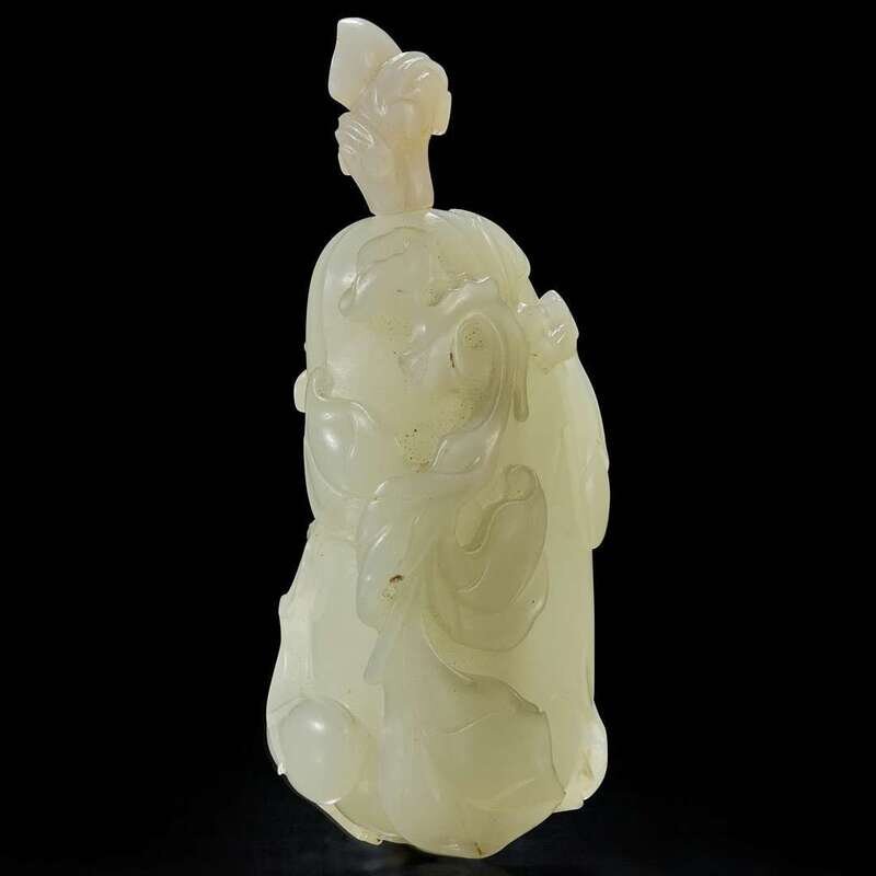 The body carved as an eggplant, surrounded by sinuous branches, leaves, and juvenile eggplant, bee and beetle to body; top carved in form of ruyi sprigs.