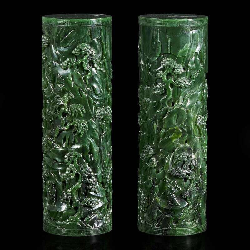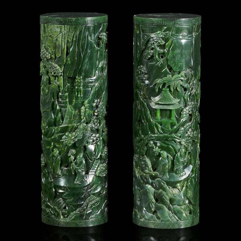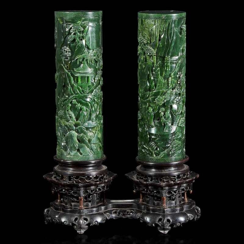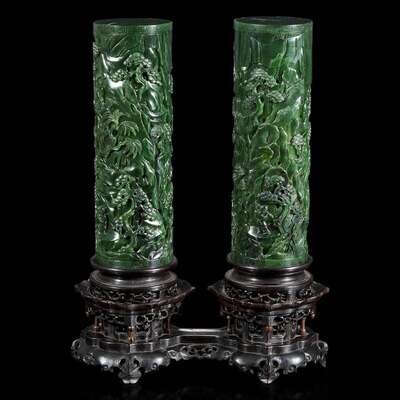 A pair of Chinese spinach jade cylinder censers and covers with wood stand 翠玉熏香炉一对及木底座 Late 19th/ early 20th century ???????????