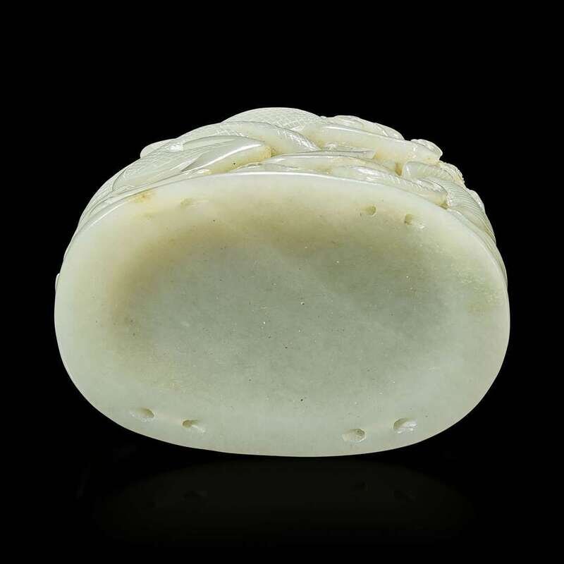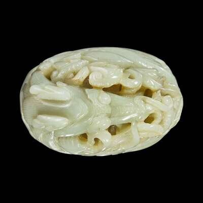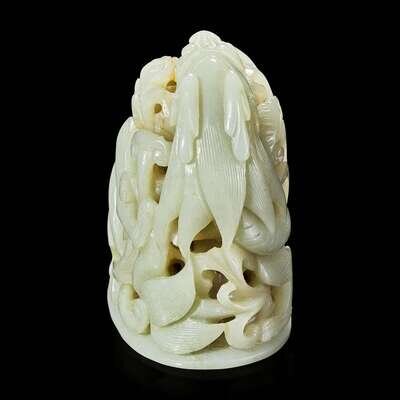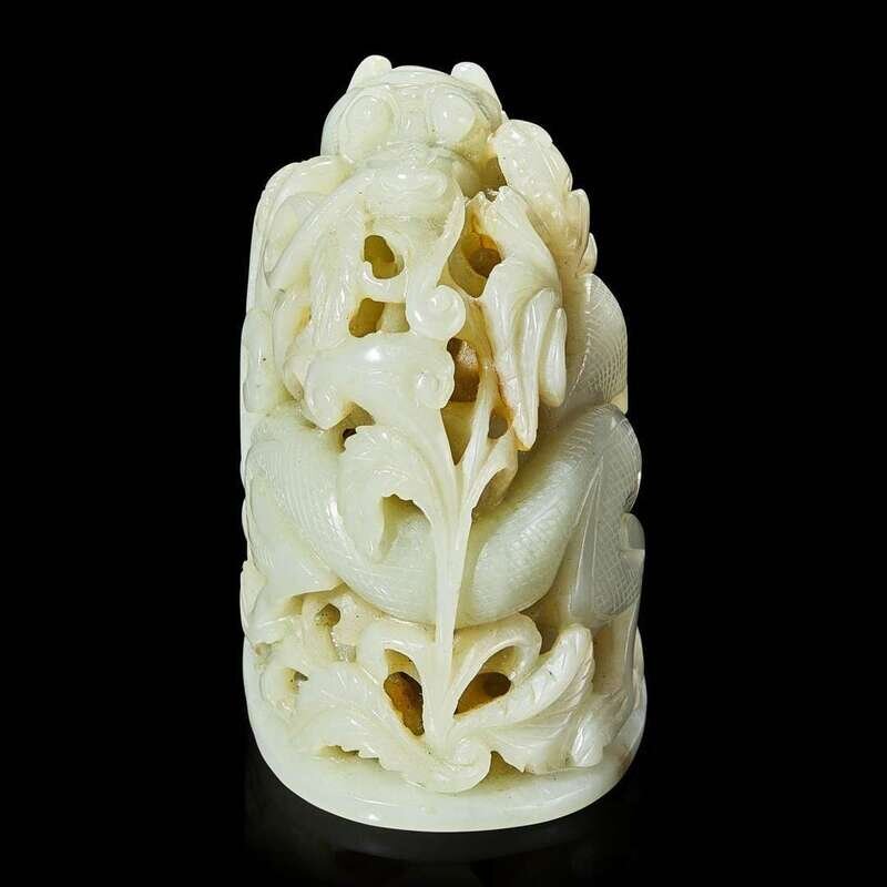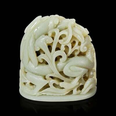 A Chinese pale celadon jade reticulated "Dragon" finial 青白玉镂空龙形炉端