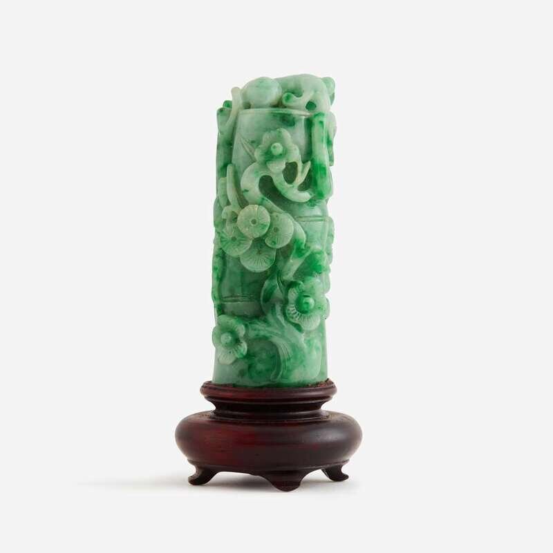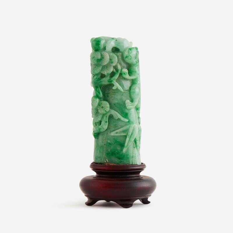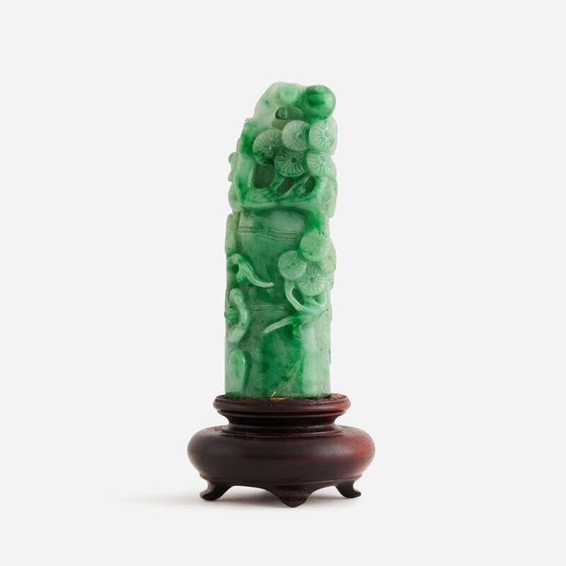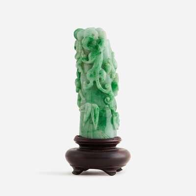 A Chinese jadeite "Qilong and 'Three Friends' " carving 翡翠雕螭龙岁寒三友柄型器