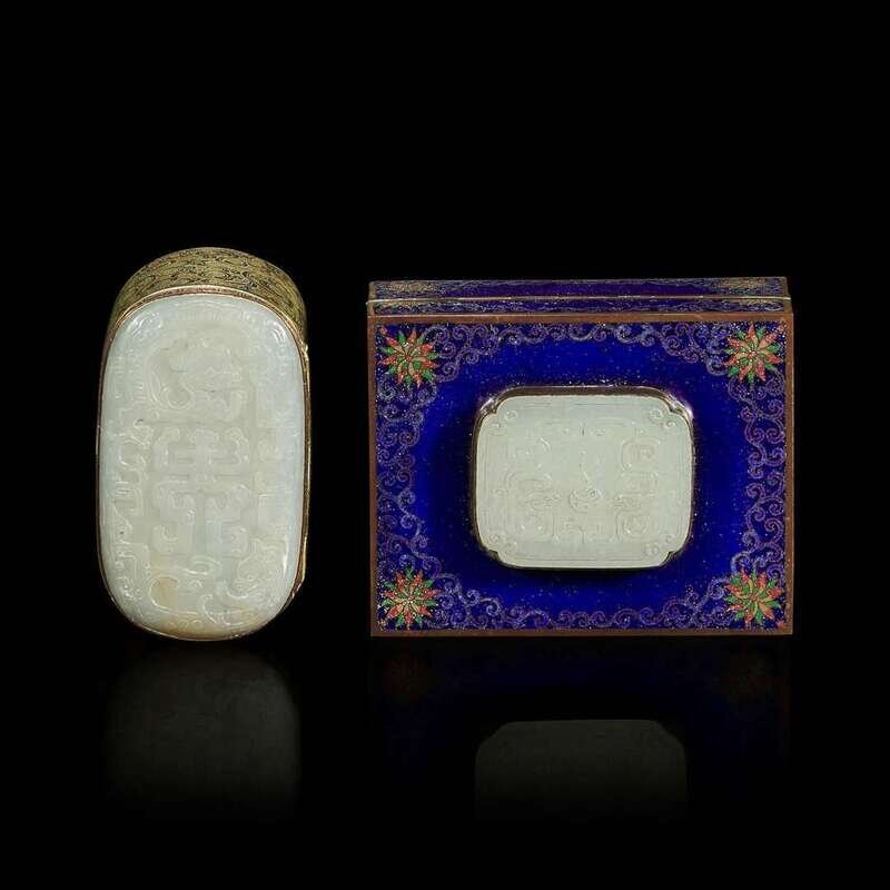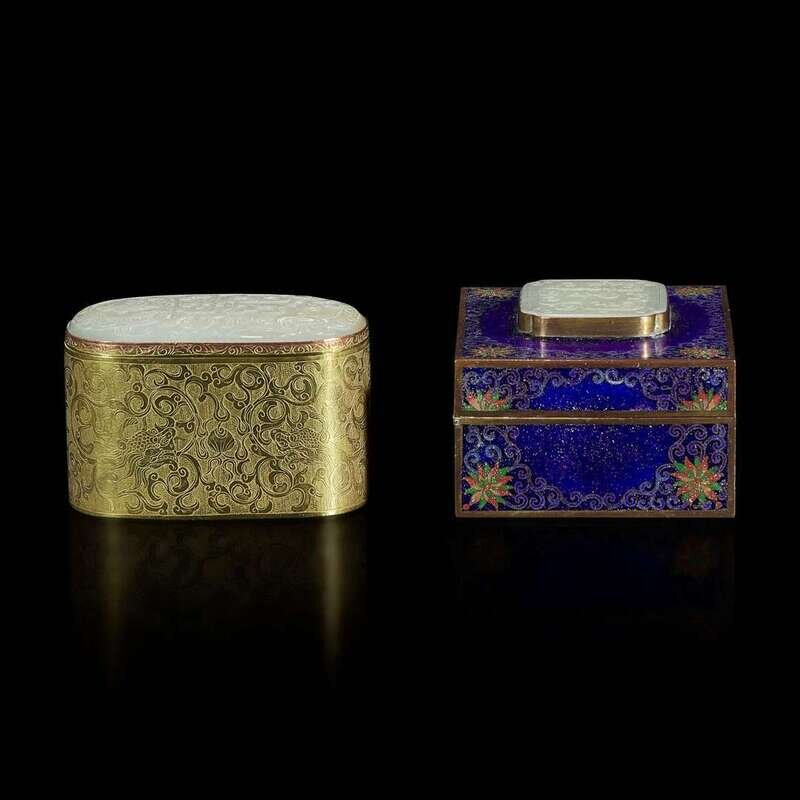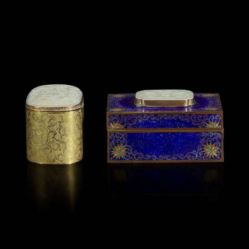 Comprising an oval gilt copper box, the cover mounted with a white jade plaque, the jade centered by a stylized "?" (shou) character, encircled by two stylized archaistic dragons, the metal engraved with dragon heads among foliate scrolls; the blue-ground cloisonné box mounted with a white jade shaped rectangular plaque centered by a jewel flanked by a pair of stylized dragon scrolls.